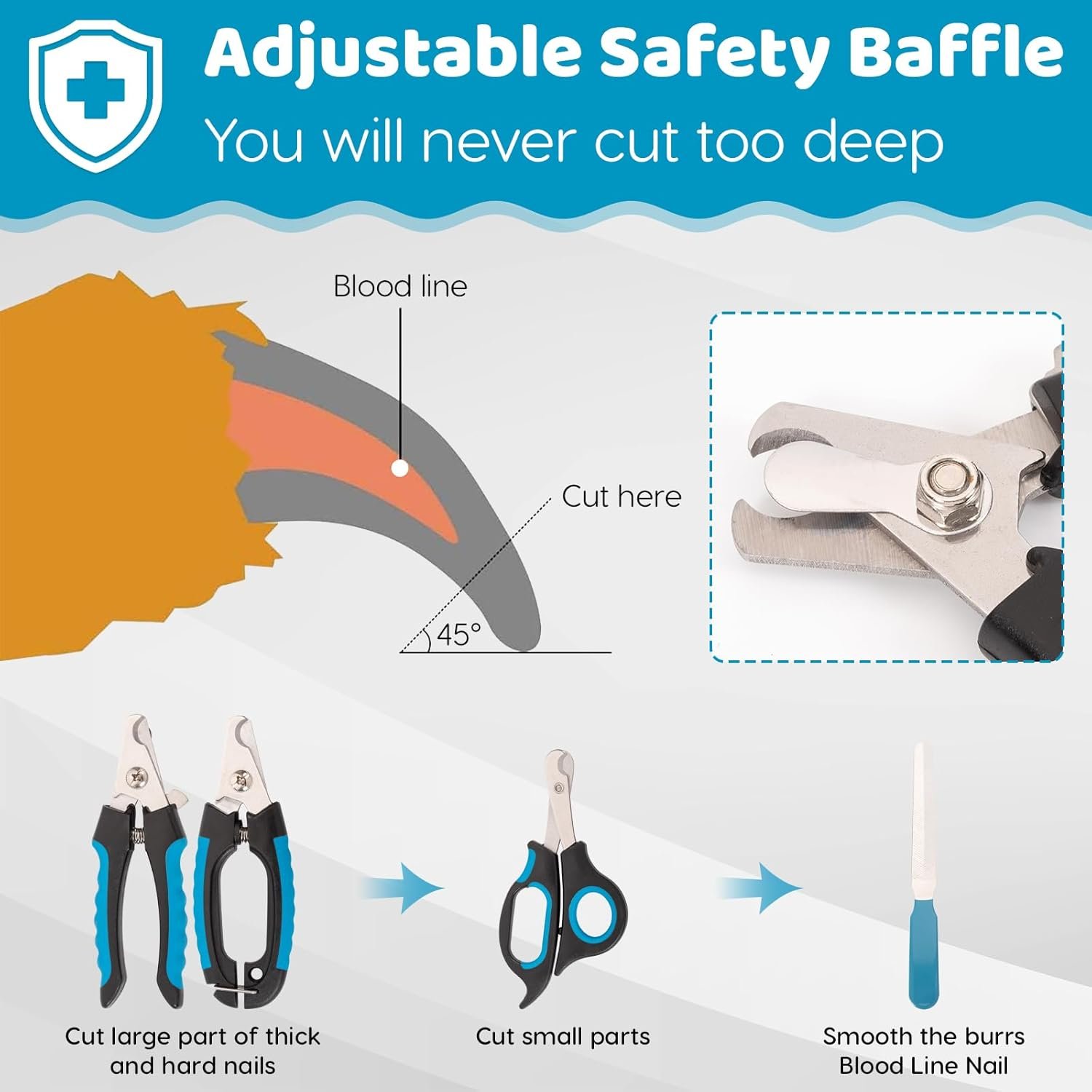 SICHERHEITSSCHUTZ Die Nagelschere für Hunde und Katzen verfügt über einen Sicherheitsschutz an der Klinge, um ein Verkürzen zu verhindern. Das abgerundete Spitzendesign gewährleistet ein sicheres Krallenschneiden für Ihr Haustier und reduziert den Stress bei der Fellpflege