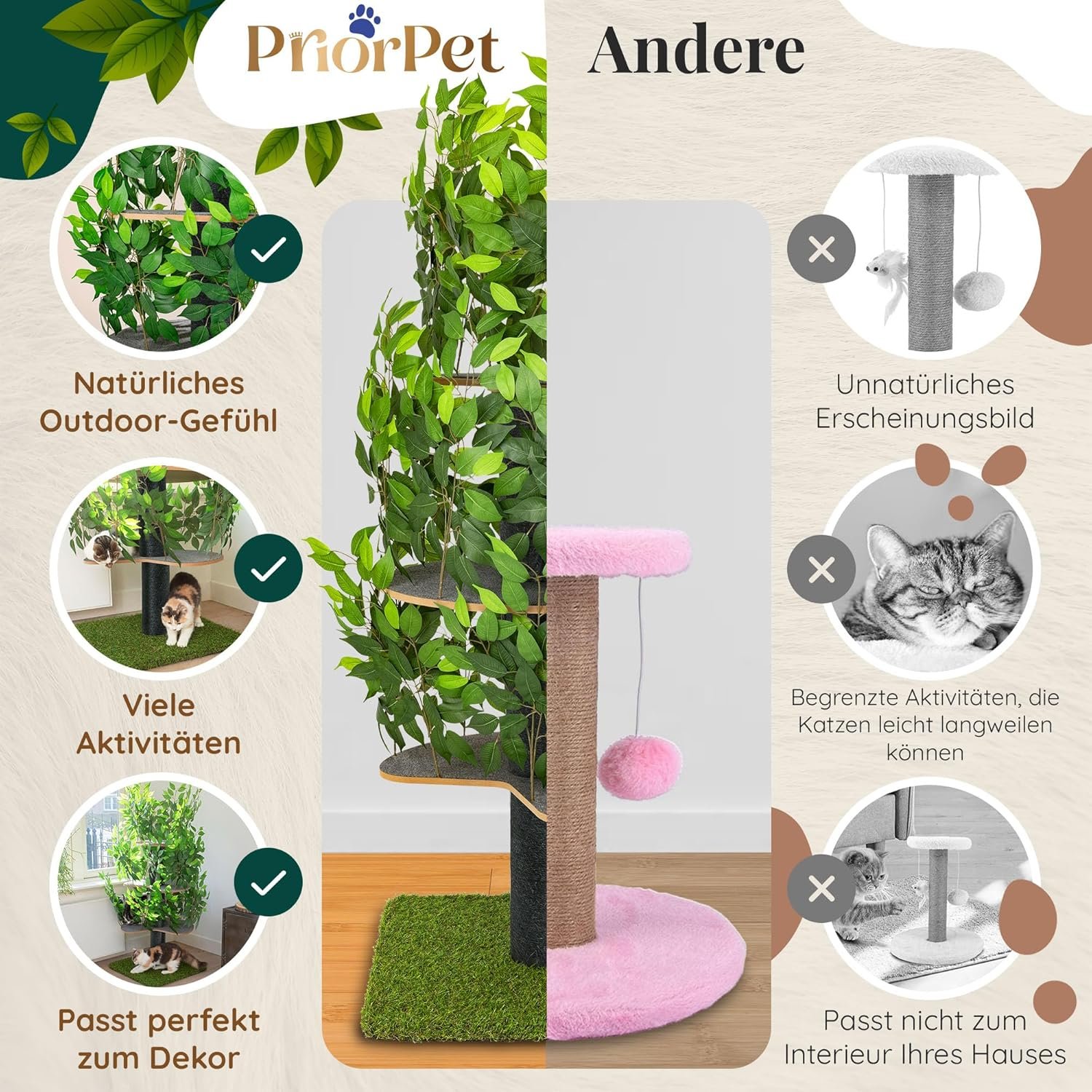 Bringen Sie die Natur ins Haus: Unser patentierter Kratzbaum sieht aus wie ein Baum und bietet Ihrer Katze die Möglichkeit, die Außenwelt zu erkunden, ohne die Sicherheit eines Innenbereichs zu verlassen. Es spricht ihre natürlichen Instinkte an und vereint das Beste aus zwei Welten.