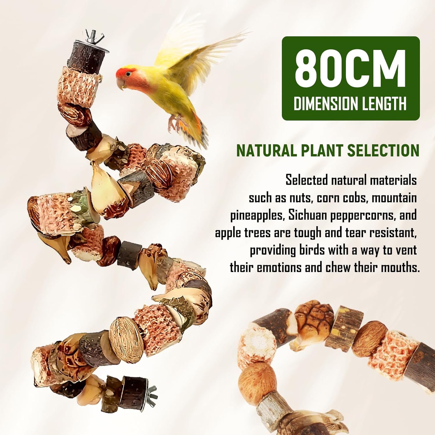Ideale Größe: Das 80 cm lange Design ist perfekt an die Aktivitätsgewohnheiten kleiner bis mittelgroßer Papageien angepasst. Es ermöglicht dem Papagei nicht nur ein freies Greifen, Klettern und Auslaufen, sondern bietet auch eine größere Kontaktfläche zum Schnabelschärfen. Dadurch wird das Problem des unzureichenden Kauvergnügens bei kurzen Spielzeugen gelöst. Eine ideale Wahl als Käfigzubehör oder Wellensittichspielzeug.