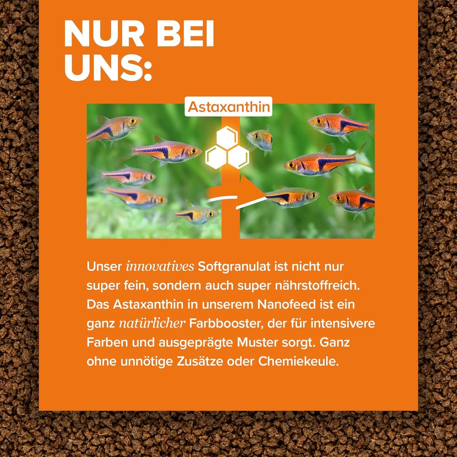 Feinkörnig: 0,2 mm Granulat, ideal für Mikrofische, Nanofische und Fischbrut ab der 4. Woche