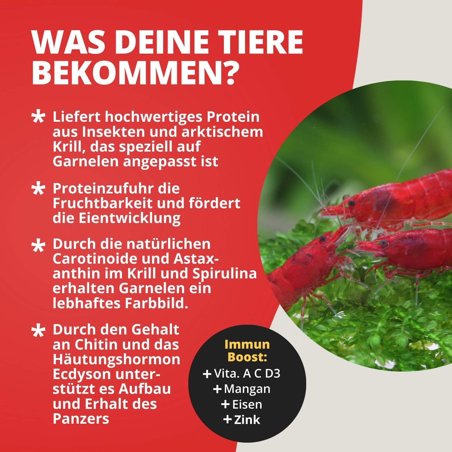 Protein-Boost: Fördert bei Wirbellosen wie Garnelen und Krebsen das Wachstum, die Eiproduktion, die Eiqualität, die Blutbildung, das Immunsystem und die Häutung. Besonders geeignet für junge Garnelen und für Garnelenweibchen in der Zucht