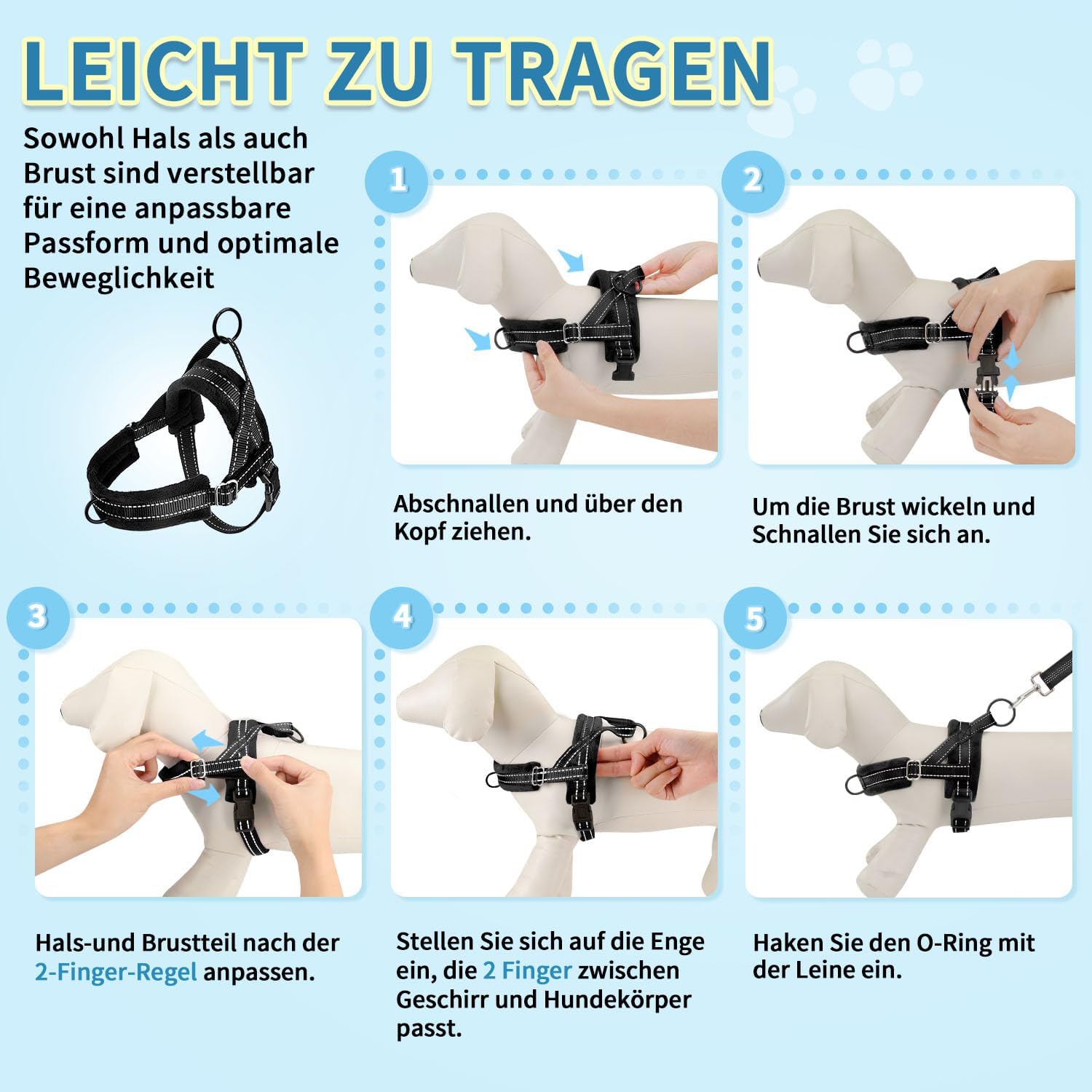 Bequemes Hundegeschirr: Die Nacken- und Rückengurte des Hundegeschirrs verfügen über ein weiches Fleece, das die Haut des Welpen besser vor Abschürfungen und Reizungen schützt. Im Gegensatz zum Hundehalsband sorgt das Hundegeschirr für eine optimale Spannungsverteilung, um Husten, Übelkeit und Erstickungsgefahr beim Hund zu vermeiden. Reflektierende Nähte an der Leine verbessern die Sichtbarkeit im Dunkeln.