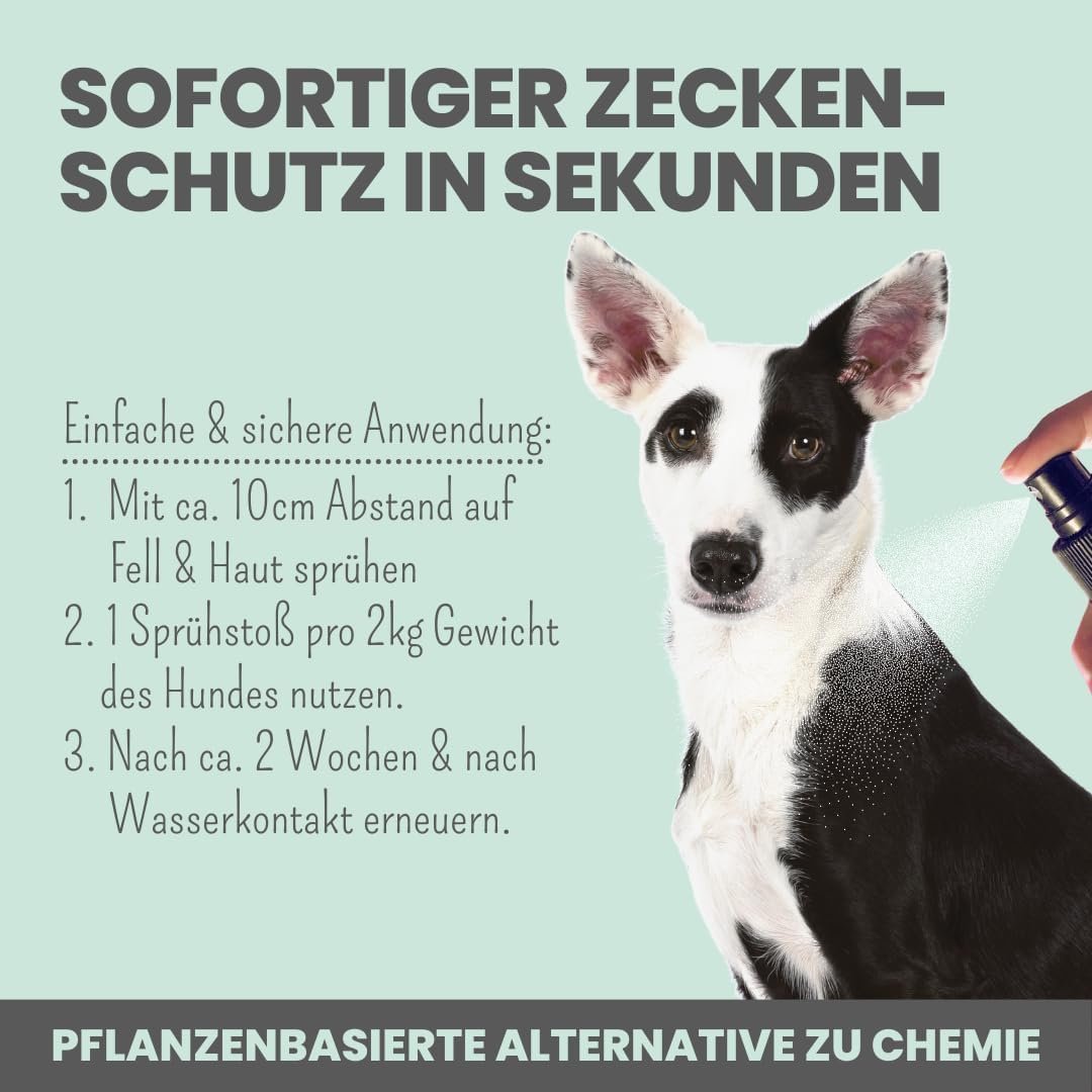 Pflanzliches Zeckenspray für Hunde mit Margosa-Extrakt, Zitronen-Eukalyptusöl, Neemöl, Geranienöl, Kokosöl, Lorbeeröl und dem wissenschaftlich nachgewiesenen Wirkstoff Saltidin.