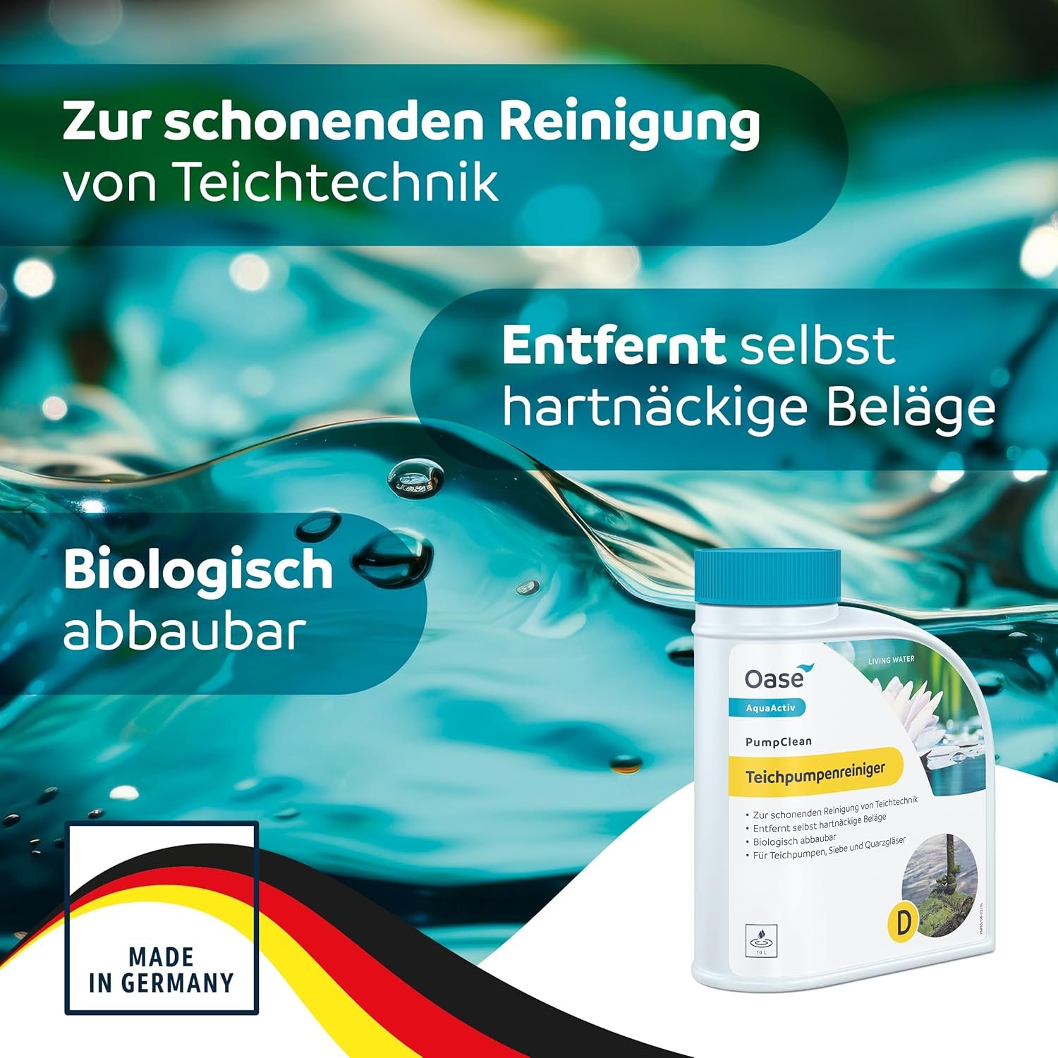Sanfte und schnelle Teichreinigung: Mit dem 100 % biologisch abbaubaren Pumpenreiniger ohne Chlor und Essig werden Kalk und andere Ablagerungen innerhalb von 24 Stunden zuverlässig entfernt