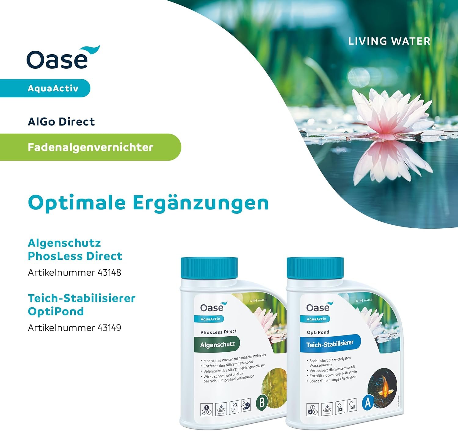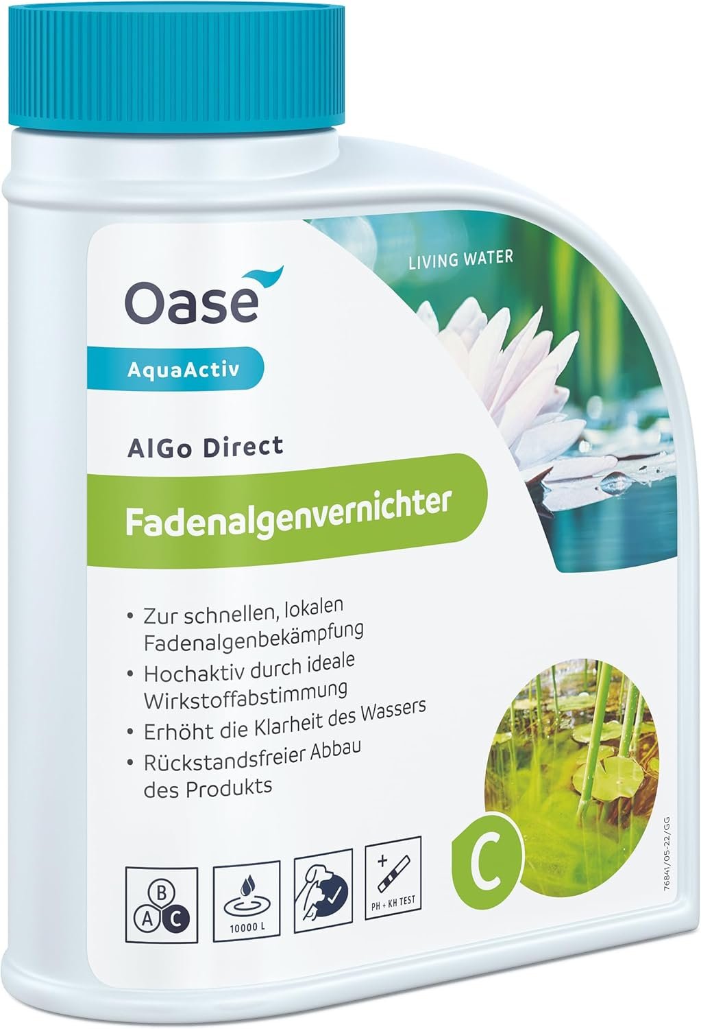Fadenfreier Teich: Der wirksame Oase AquaActiv AlGo Direct Fadenalgenvernichter (500 ml für 10.000 Liter) mit Dosierhilfe inklusive KH-Schnelltest eignet sich besonders zur gezielten Behandlung hartnäckiger Fadenalgen im Teich