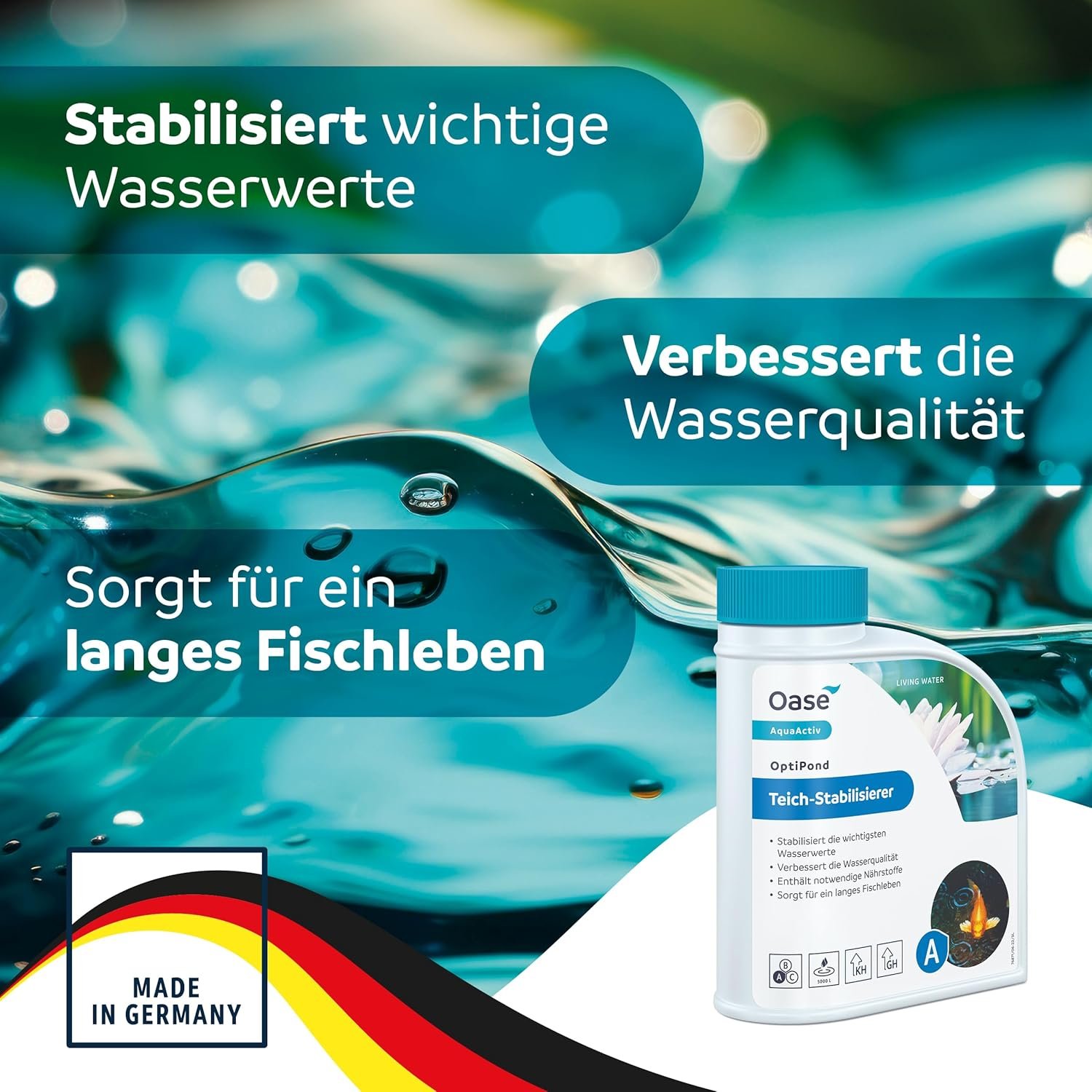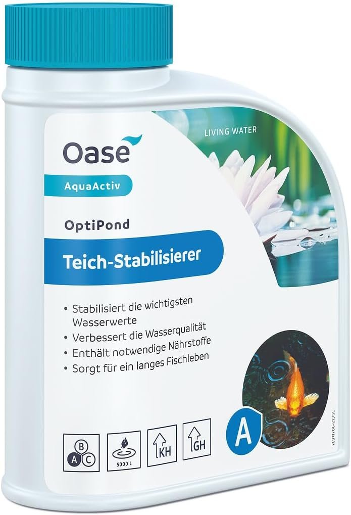 Wasserqualität verbessern: Der ausgewogene Oase AquaActiv OptiPond Teichstabilisator (500 ml für 5.000 Liter) mit Dosierhilfe sorgt für optimale Wasserverhältnisse im Teich und bindet Schadstoffe wie Ammonium und Ammoniak wirksam