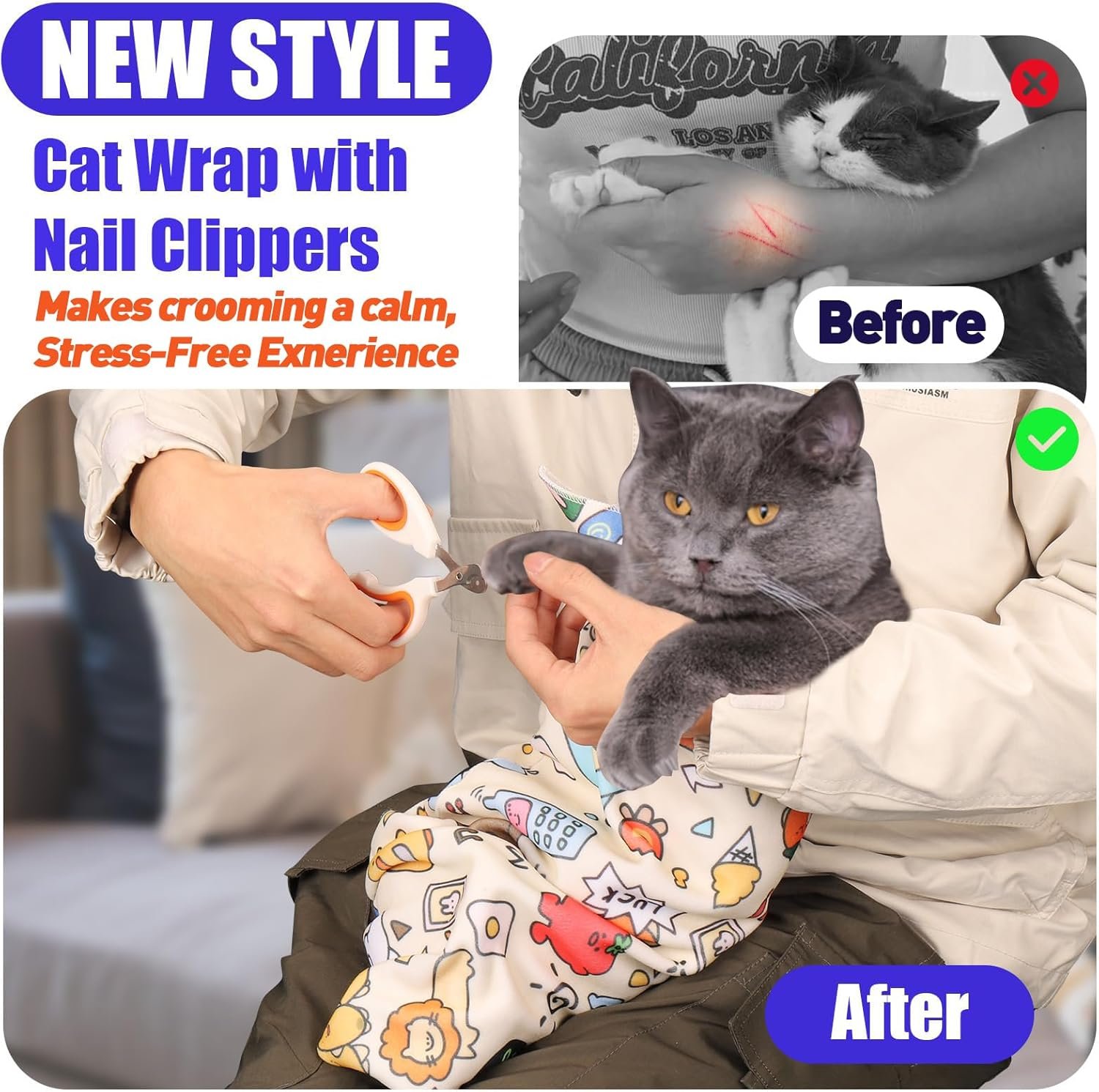 Fortschrittliche selbstklebende Katzenhülle: Im Vergleich zu herkömmlichen Katzenfesseln umhüllt diese Hülle Ihre Katze sicher und verhindert, dass sie entkommt oder hängenbleibt. Einfach zu verwenden, kleben Sie einfach die Vorder- und Rückseite zusammen und bleiben Sie stabil, sodass Sie sich keine Sorgen machen müssen, dass es herunterfällt. Sie können es sicher beim Schneiden oder Baden von Nägeln verwenden