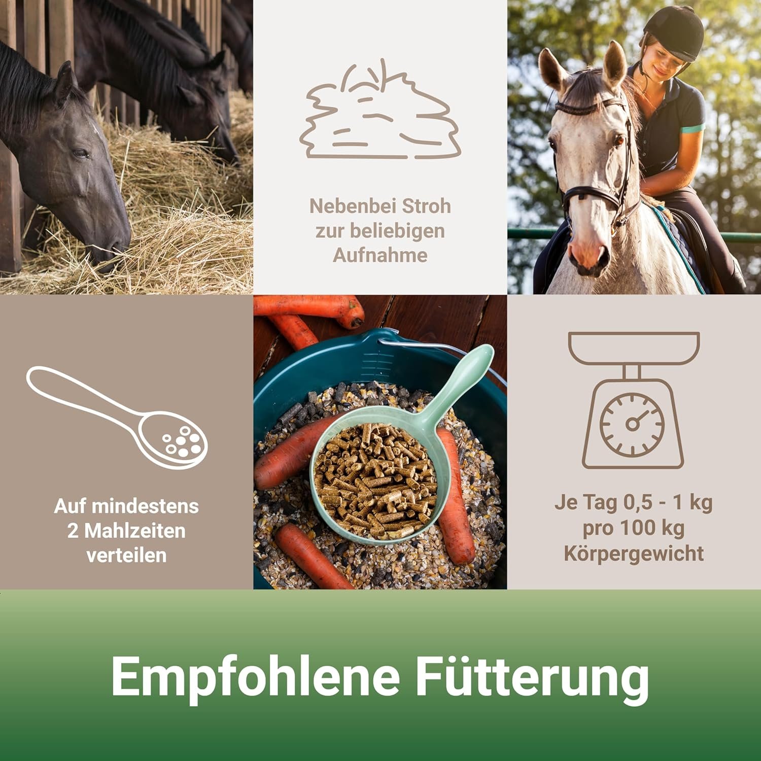 Fütterung: Das Alleinfutter sollte auf zwei Mahlzeiten pro Tag verteilt werden. Insgesamt 0,5 – 1 kg Pferdefutter pro 100 kg Körpergewicht und Tag verfüttern
