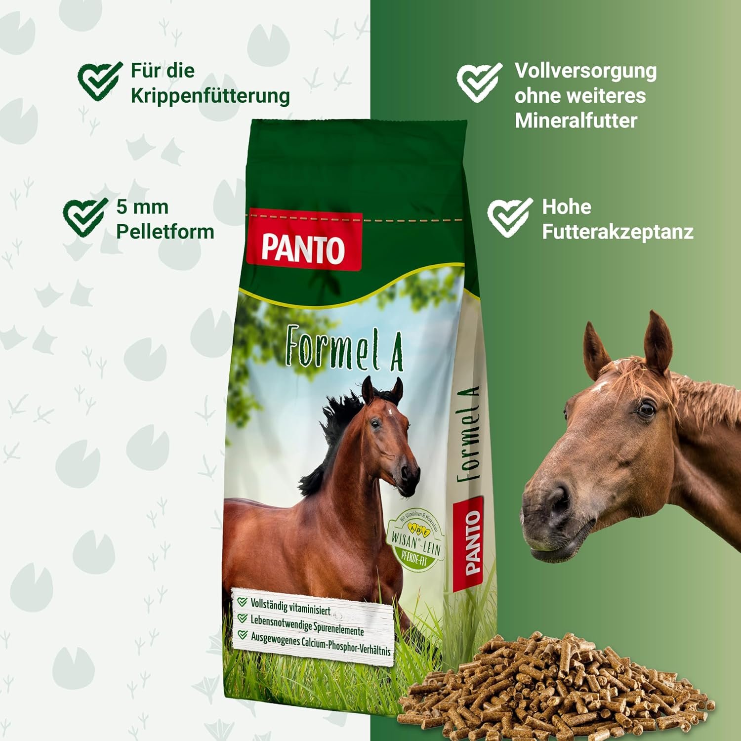 Pferdefutter: PANTO Formula A ist unser Allrounder für die Krippe. Das Pelletfutter in 5 mm Größe kann als Alleinfuttermittel oder als Ergänzungsfuttermittel zu Hafer verfüttert werden