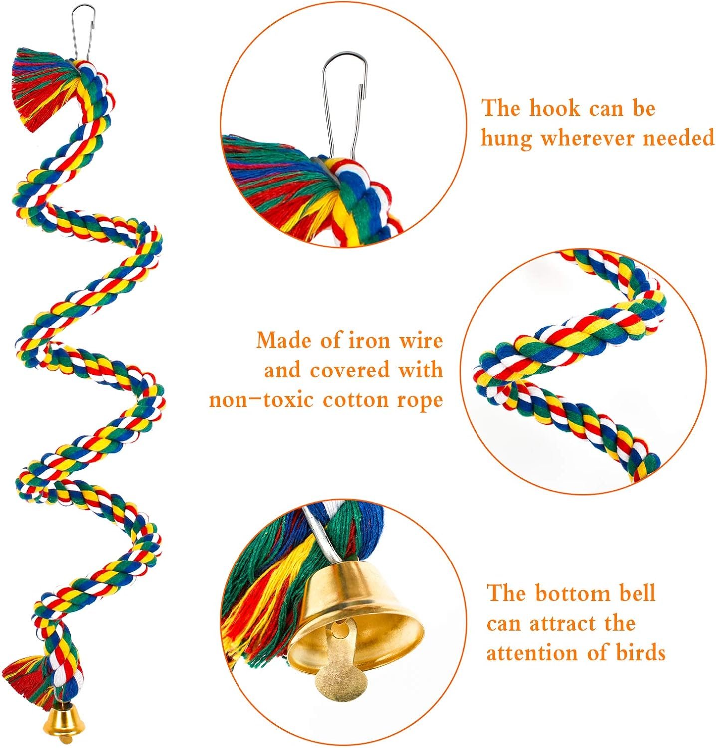 — Das bunte Papageien-Kletterseil besteht aus Eisendraht und ist mit einem ungiftigen Baumwollseil ummantelt. Es hat eine gute Flexibilität und kann in jede beliebige Form gerollt werden.
