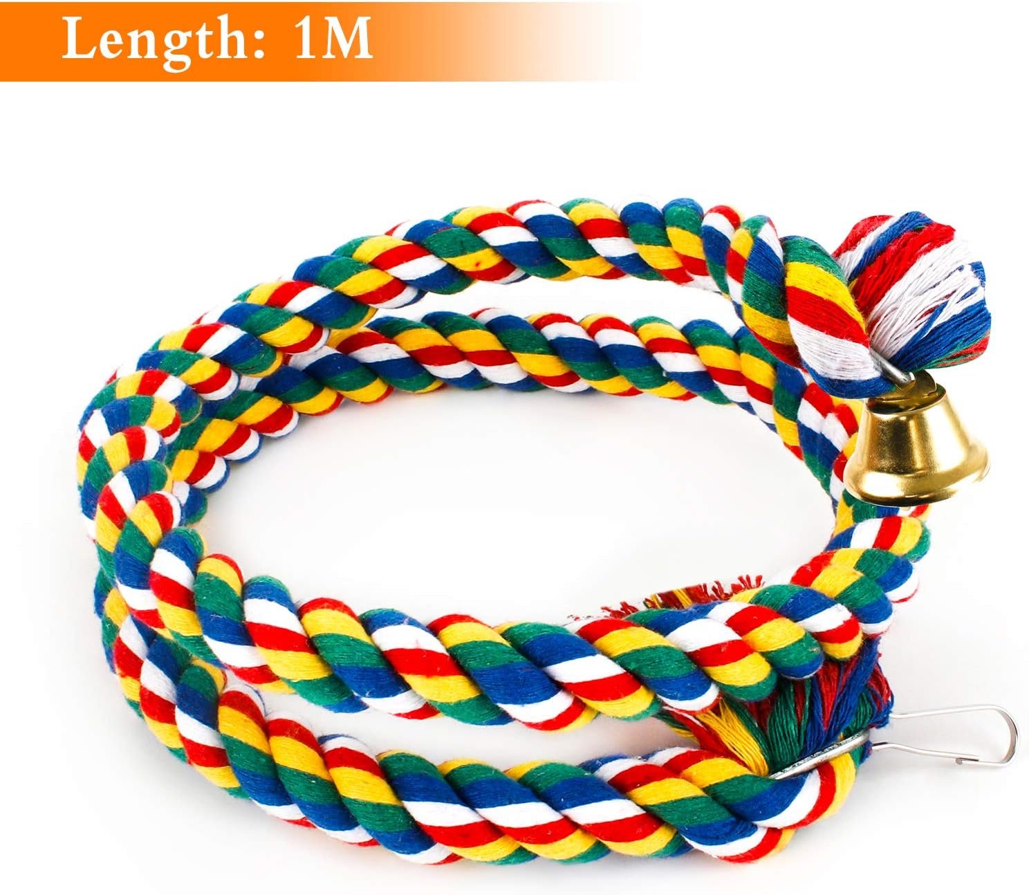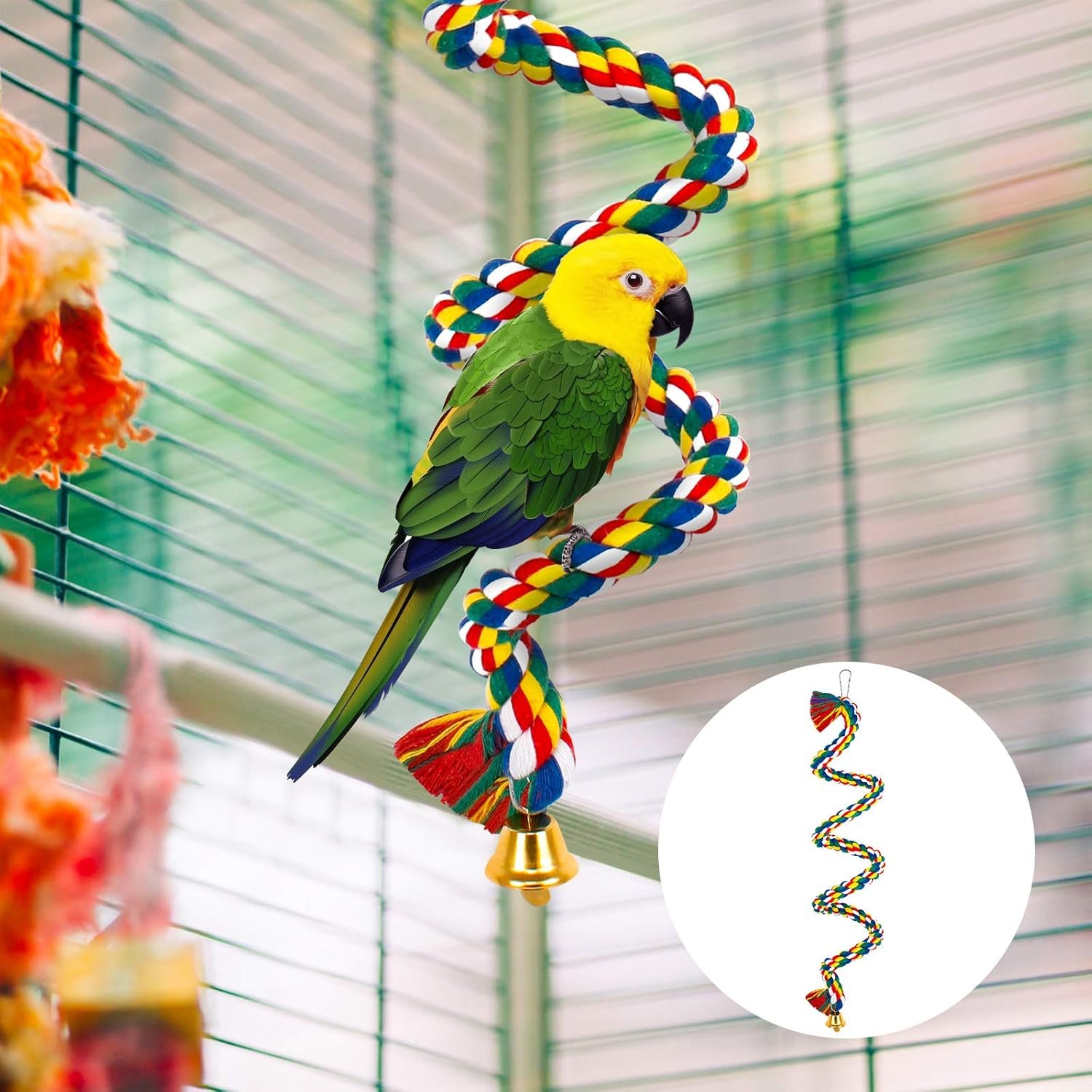 Aufhängbar: An der Oberseite des Vogelseils mit Glocke befindet sich ein Haken, den Sie überall dort aufhängen können, wo Sie ihn benötigen. Die kleine Glocke am anderen Ende gibt klare Musik ab, sodass der Papagei die Spielzeit genießen kann.
