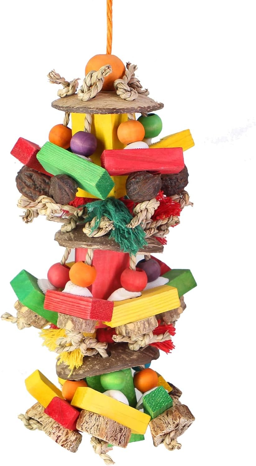Sicheres Material: Unsere Vogelspielzeuge bestehen aus langlebiger Kokosnussschale, Naturholz, Nüssen und Schalen und werden von einem essbaren Strohseil getragen. Alle sind mit essbaren Pigmenten gefärbt und von Hand bearbeitet, was für Vögel eine höhere Bissfestigkeit und Haltbarkeit zum Kauen und Spielen bietet. Sie sind zum Klettern in mehreren Schichten angeordnet