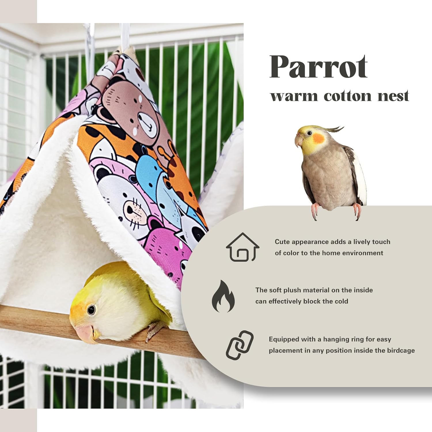 Easy to put in and take out: this soft winter warm bird nest house offers your dear birds a warm and cosy refuge where pets can rest well, and has a large opening so that pets can land easily.