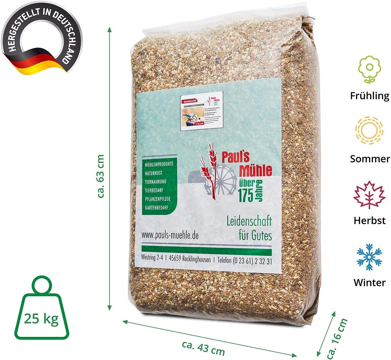 Deluxe Qualität, enthält keine Vogelbeeren Premium Qualität, ohne Netze, ohne Folie, sehr gute Akzeptanz Premium Qualität, ideal für die Brutzeit und Aufzucht Premium Qualität, Alleinfutter für alle freilebenden Vögel Premium Qualität aus Argentinien, frisch und ungeröstet Premium Qualität aus Argentinien, frisch und ungeröstet