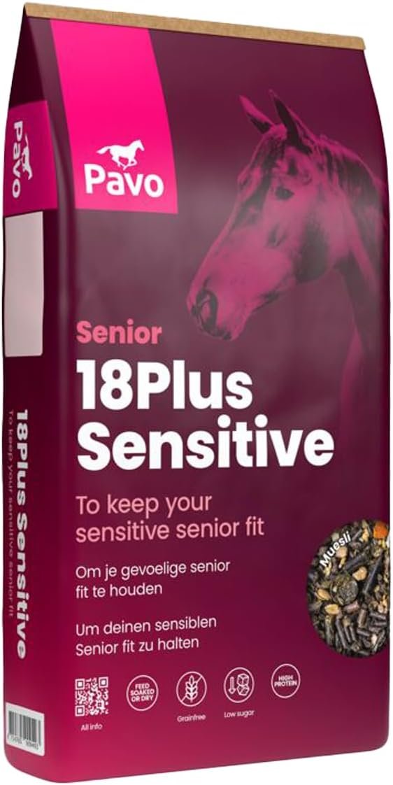 Speziell für ältere Pferde: Pavo 18Plus Sensitive wurde speziell für ältere Pferde entwickelt, die empfindlich auf Zucker und Getreidestärkefutter reagieren, und bietet eine ausgewogene Ernährung für deren besondere Bedürfnisse.