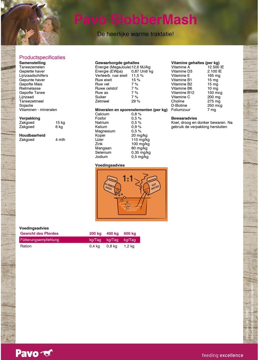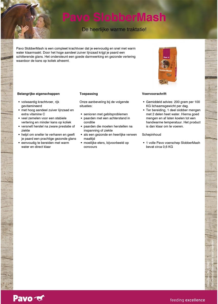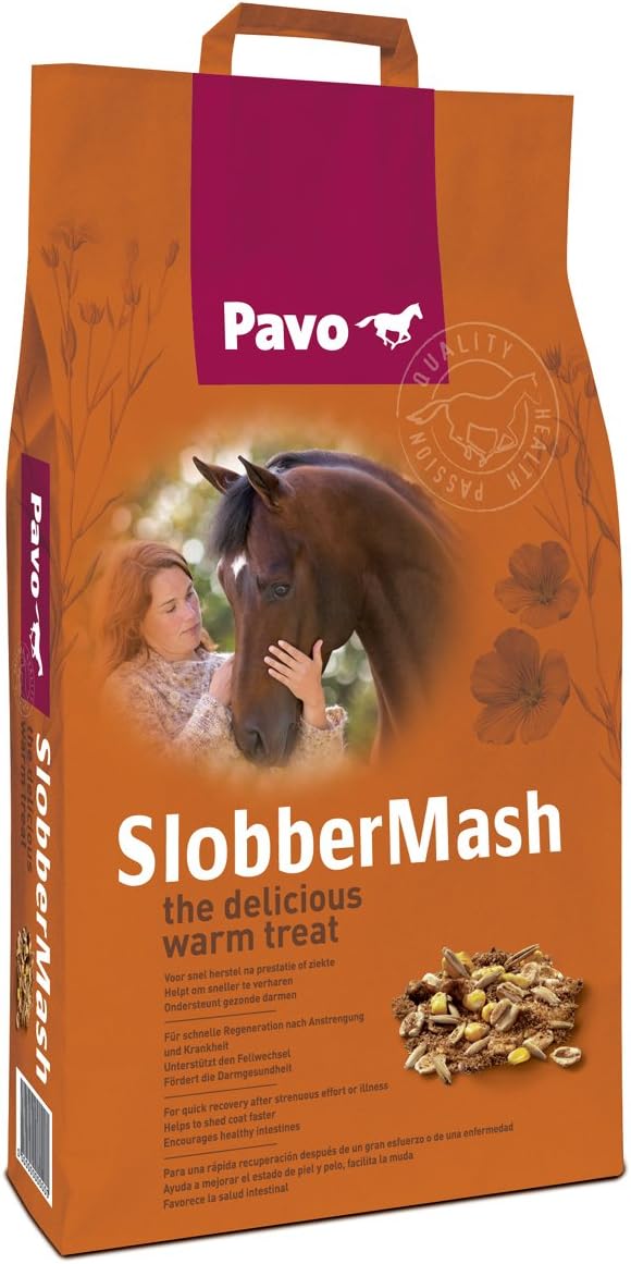 Pavo SlobberMash ist ein vollwertiges Kraftfutter, das schnell und einfach mit heißem Wasser zubereitet wird. Der hohe Anteil an reinem Leinsamen verleiht dem Fell Ihres Pferdes einen wunderbaren Glanz. Pavo SlobberMash zieht leicht ein und sorgt für eine schnelle Erholung nach großer Anstrengung oder nach einer Krankheit. Es unterstützt die Darmfunktion und eine gesunde Verdauung.