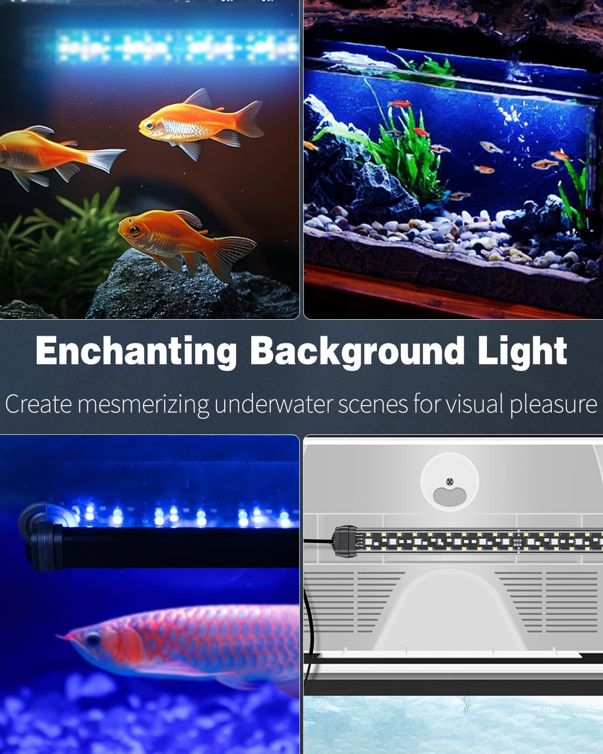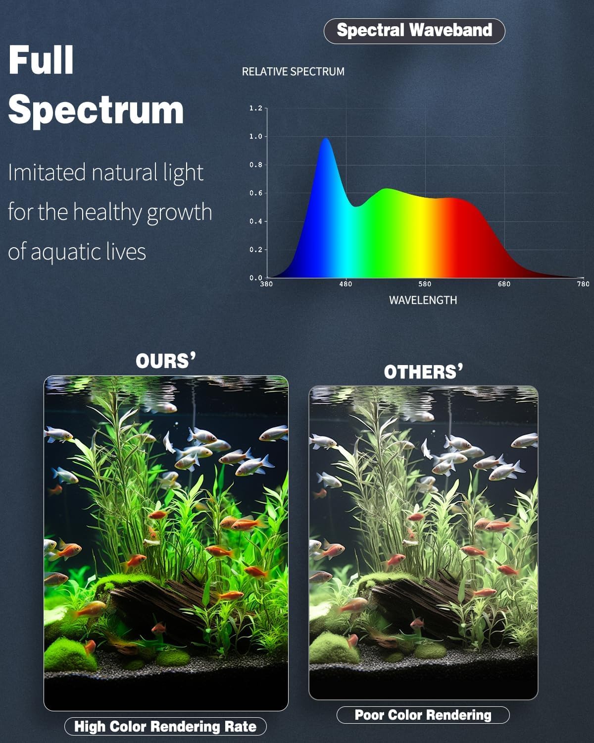 24/7-Naturmodus Das LED-Licht startet automatisch um 6 Uhr morgens und schaltet sich um 22 Uhr aus. Es simuliert die natürlichen Veränderungen von Sonnenaufgang, Sonnenuntergang und Mondlicht während des Tages, was Ihren Fischen viel Energie gibt und sie in einen gesunden Schlaf versetzt.