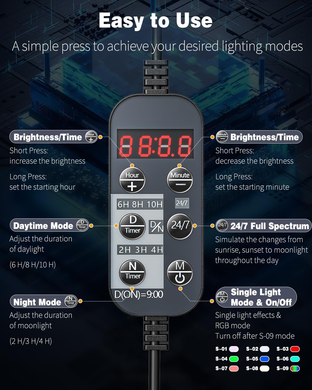 Eingebauter Dimmer zur Helligkeitssteuerung: Mit den mehrfarbigen LEDs können Sie über die Tasten „Stunde“ und „Minute“ die Startzeit einstellen. Außerdem bietet es 10 einstellbare Helligkeitsstufen. Sie können die Helligkeit frei an die Wachstumsbedürfnisse Ihrer Fische anpassen.