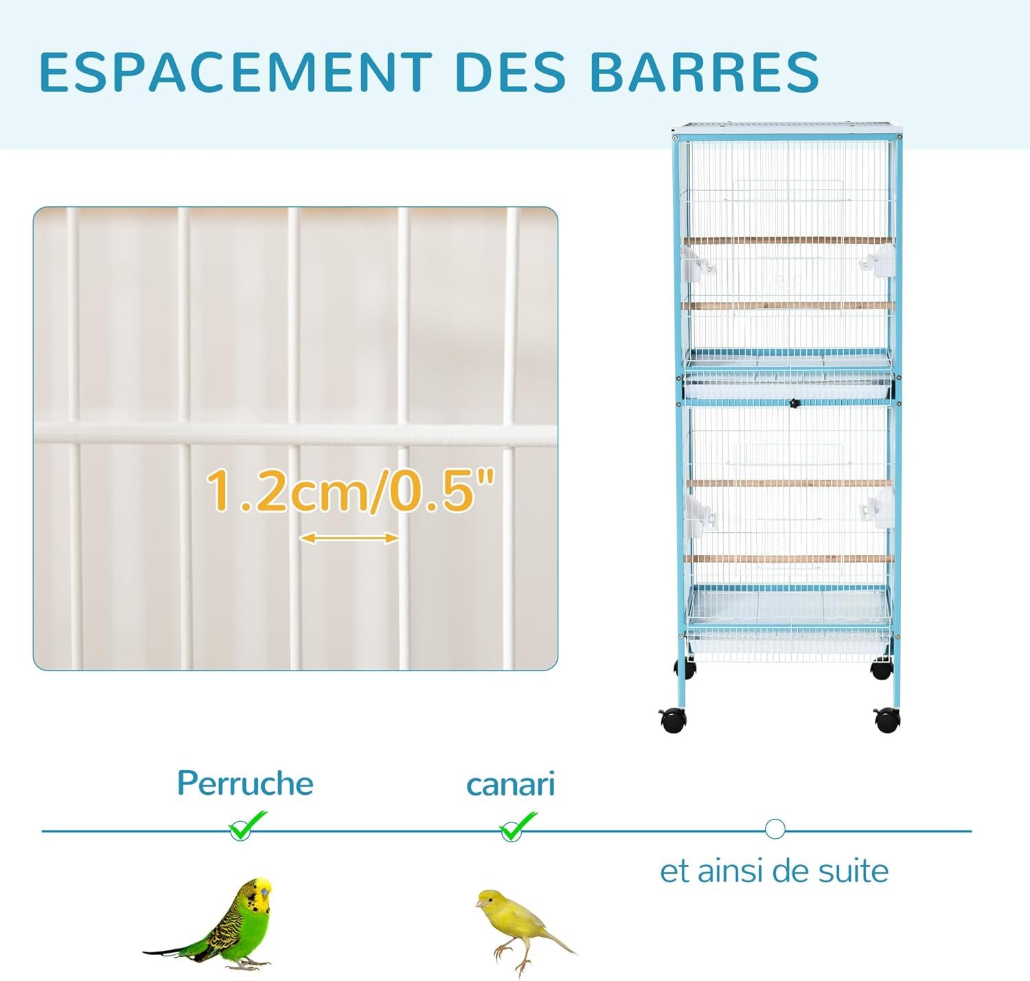 Große Breite für den Komfort der Vögel Ziehen Sie die obere Schublade heraus, um die beiden Käfige zu einem großen Käfig zu verbinden Türen auf drei Seiten für einfachen Zugang, insgesamt vier Türen Zwei Futterbehälter und zwei Holzstangen pro Käfig für mehrere Tiere Mit Rollen für einfaches Verschieben Einfach zu reinigen mit herausziehbaren Schubladen Solider, langlebiger Stahl-Draht Montage erforderlich