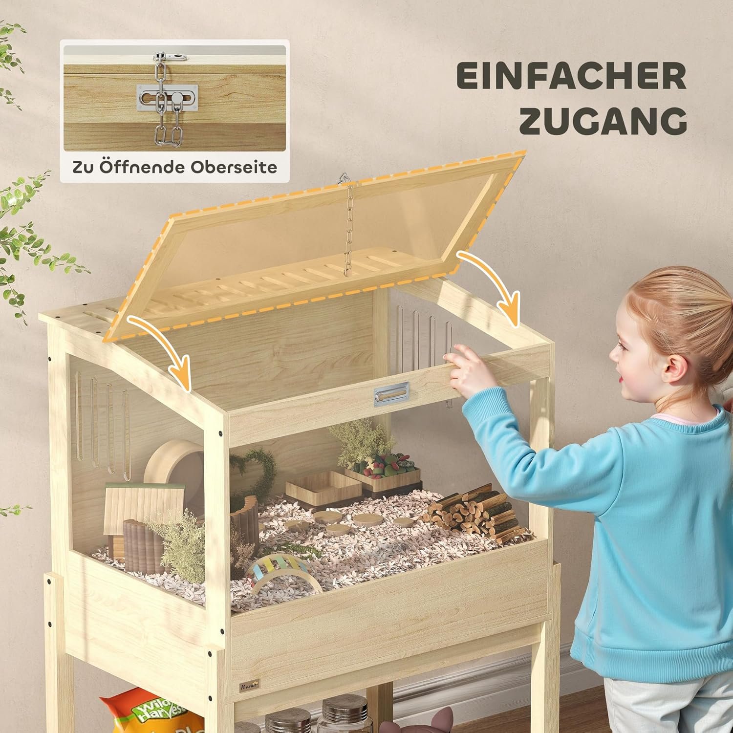 ERHÖHT UND ZUGÄNGLICH Dank der aufklappbaren Oberseite ist dieser Kleintierkäfig leicht zugänglich und steht erhöht, was die Verwendung und Reinigung erleichtert – was Zeit und Mühe spart!