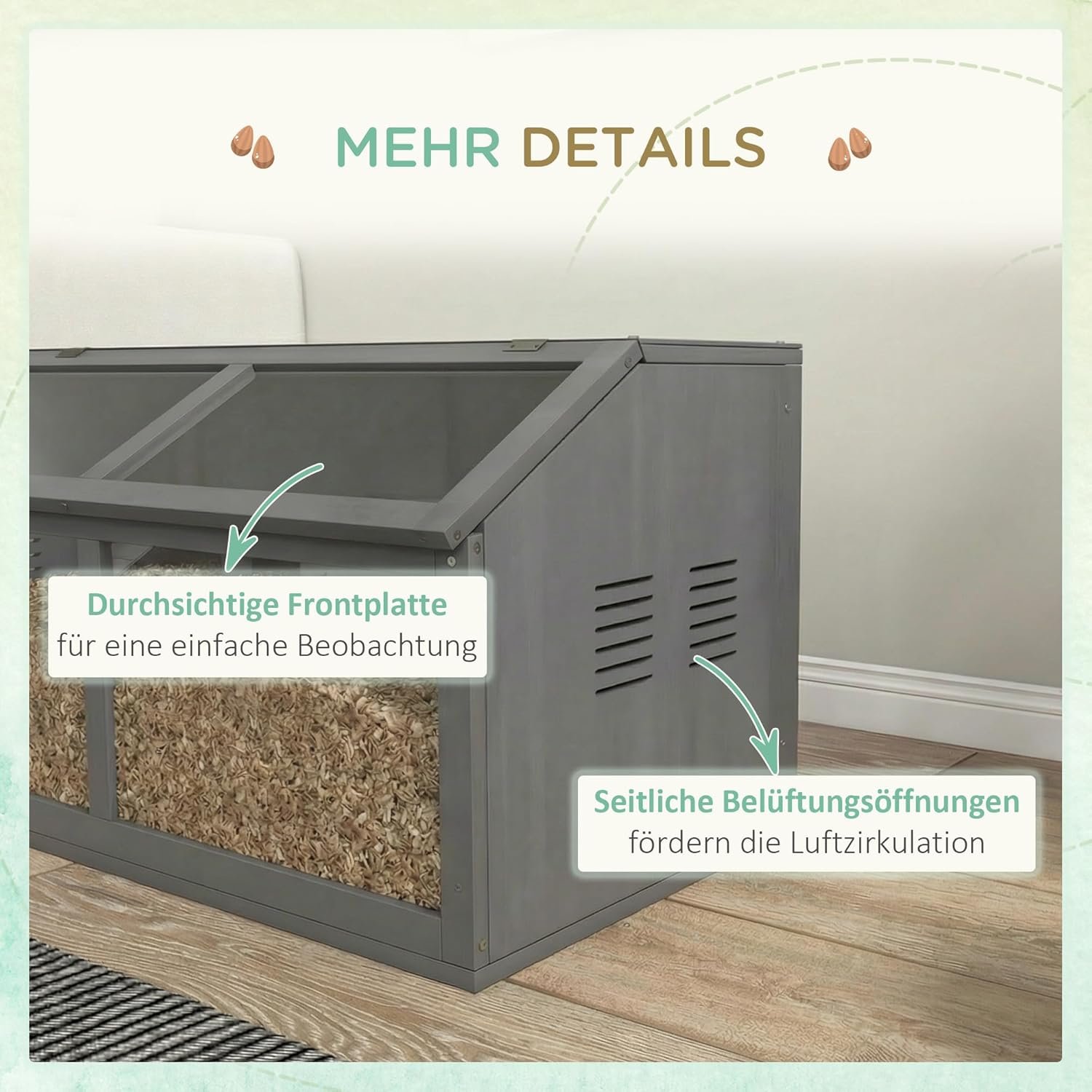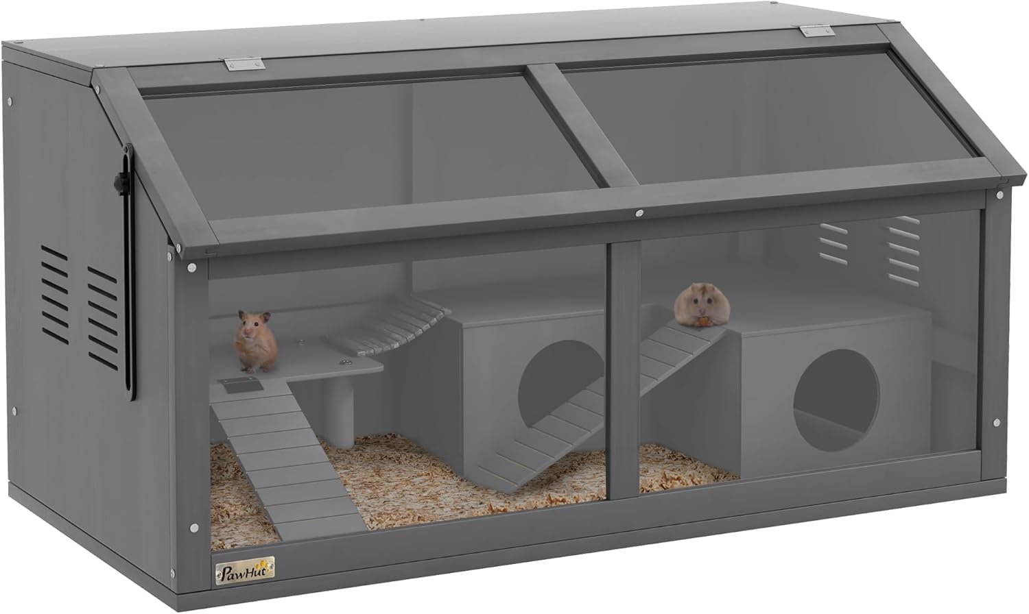 OPTIMALE SICHT UND BELÜFTUNG Durch die transparente Frontplatte haben Sie die täglichen Aktivitäten Ihres Zwerghamsters im Blick. Die seitlichen Lüftungsschlitze sorgen für eine hervorragende Luftzirkulation und halten den Nagerkäfig für Ihren pelzigen Freund angenehm frisch