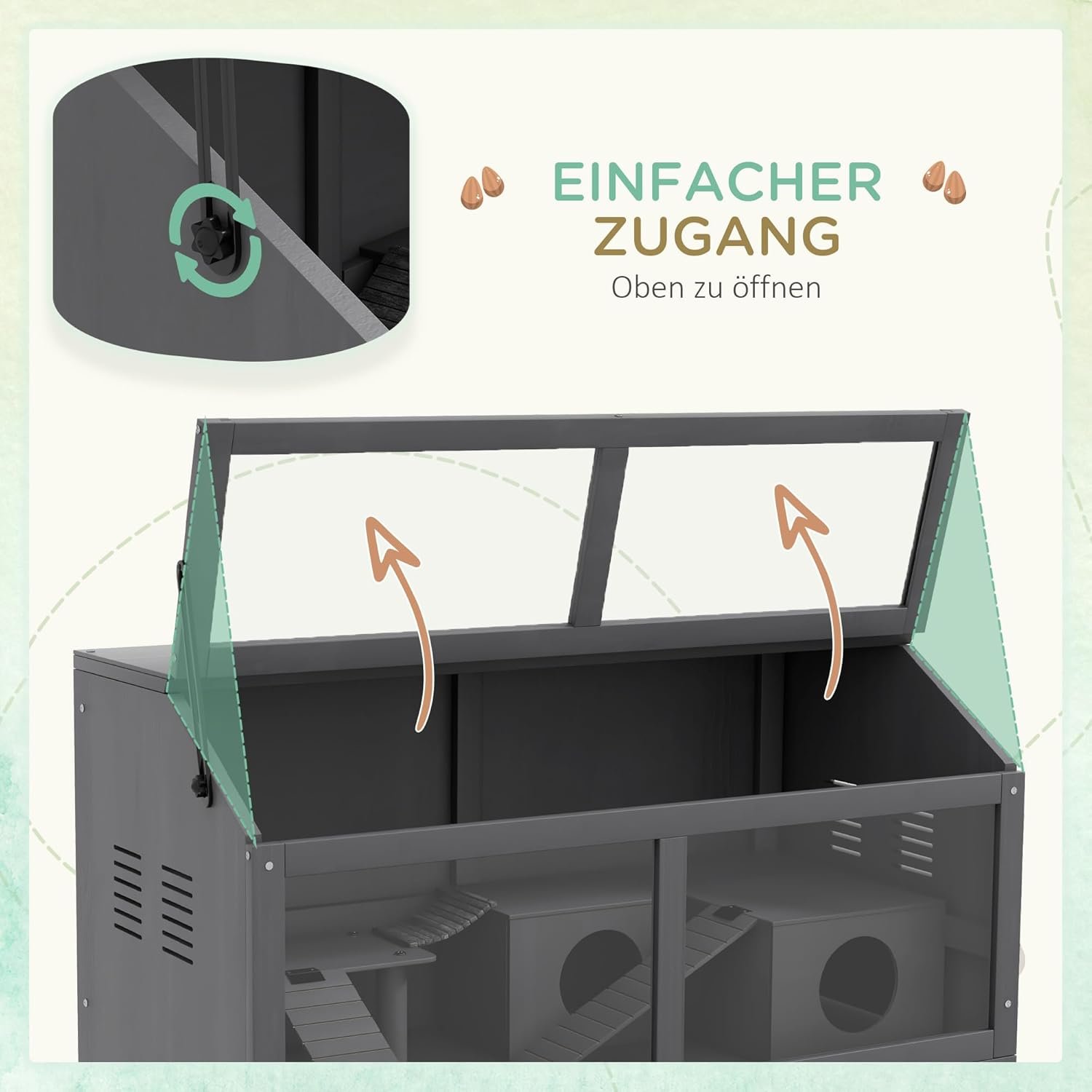 EINFACHER ZUGANG Die obere Tür ermöglicht Ihnen mühelosen Zugang zum Käfig, sodass Sie Ihr Haustier problemlos füttern und mit ihm interagieren können. Darüber hinaus bietet der Deckel praktischen Stauraum für Zwerghamstervorräte, sodass alles ordentlich und griffbereit bleibt. Genießen Sie eine stressfreie Pflege