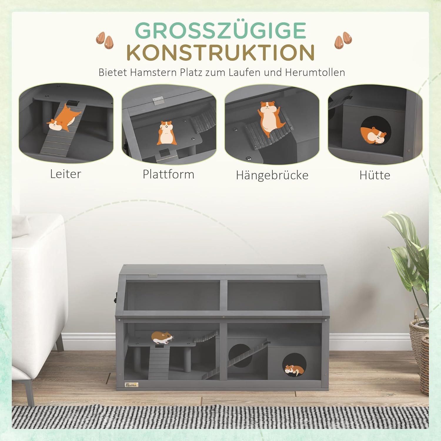 Mit einer Plattform zur Erweiterung des Aktionsbereichs Der Hamster Käfig enthält eine Hängebrücke, eine Hütte und vieles mehr für Bewegungs- und Versteckmöglichkeiten Hergestellt aus Tanneholz für zusätzliche Stabilität Der Kleintierkäfig lässt sich oben öffnen, für einfachen Zugang und Interaktion Vorderes Paneel des Zwerghamster Käfigs aus transparentem Material für eine einfache Einsicht in das Lebens Ihres Haustieres Seitliche Belüftungsöffnungen des Hamsterkäfigs fördern die Luftzirkulation Geeignet für Zwerghamster Montage erforderlich