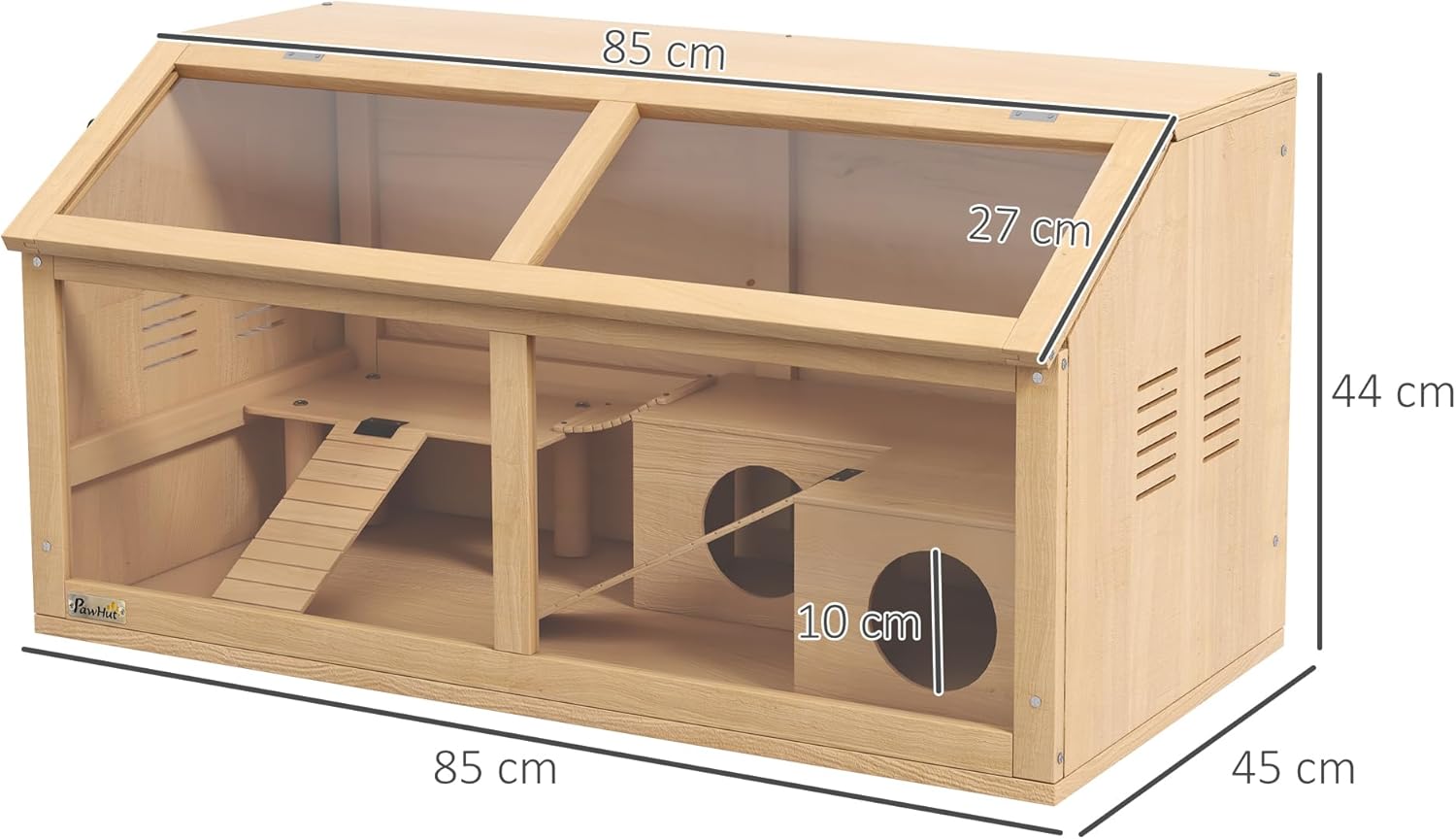 Mit einer Plattform zur Erweiterung des Aktionsbereichs. Enthält eine Hängebrücke, eine Kabine und vieles mehr für Bewegung und Verstecke. Hergestellt aus Tannenholz für zusätzliche Stabilität. Nach oben zu öffnen für einfachen Zugang und Interaktion. Frontplatte des Kleintierstalls aus transparentem Material für einen einfachen Einblick in das Leben Ihres Haustiers. Seitliche Belüftungsöffnungen des Zwerghamsterkäfigs fördern die Luftzirkulation. Geeignet für Zwerghamster. Montage erforderlich. Farbe: Naturholz. Material: Tannenholz, Acryl, Mehrschichtplatte. Gesamtabmessungen: 85 x 45 x 44 cm (L x B x H) Obere Tür 85 L x 27 B cm Hut 43 L x 31 B x 15 H cm Leiter 22,5 L x 8 B cm, 30 L x 8 B cm Plattform 28 L x 15 B x 13 H cm Hängebrücke 13,5 L x 8 B cm Lagerfläche 85 x 20,5 cm (L x B) Lieferumfang: 1 x Zwerghamster Käfig, 1 x Anleitung