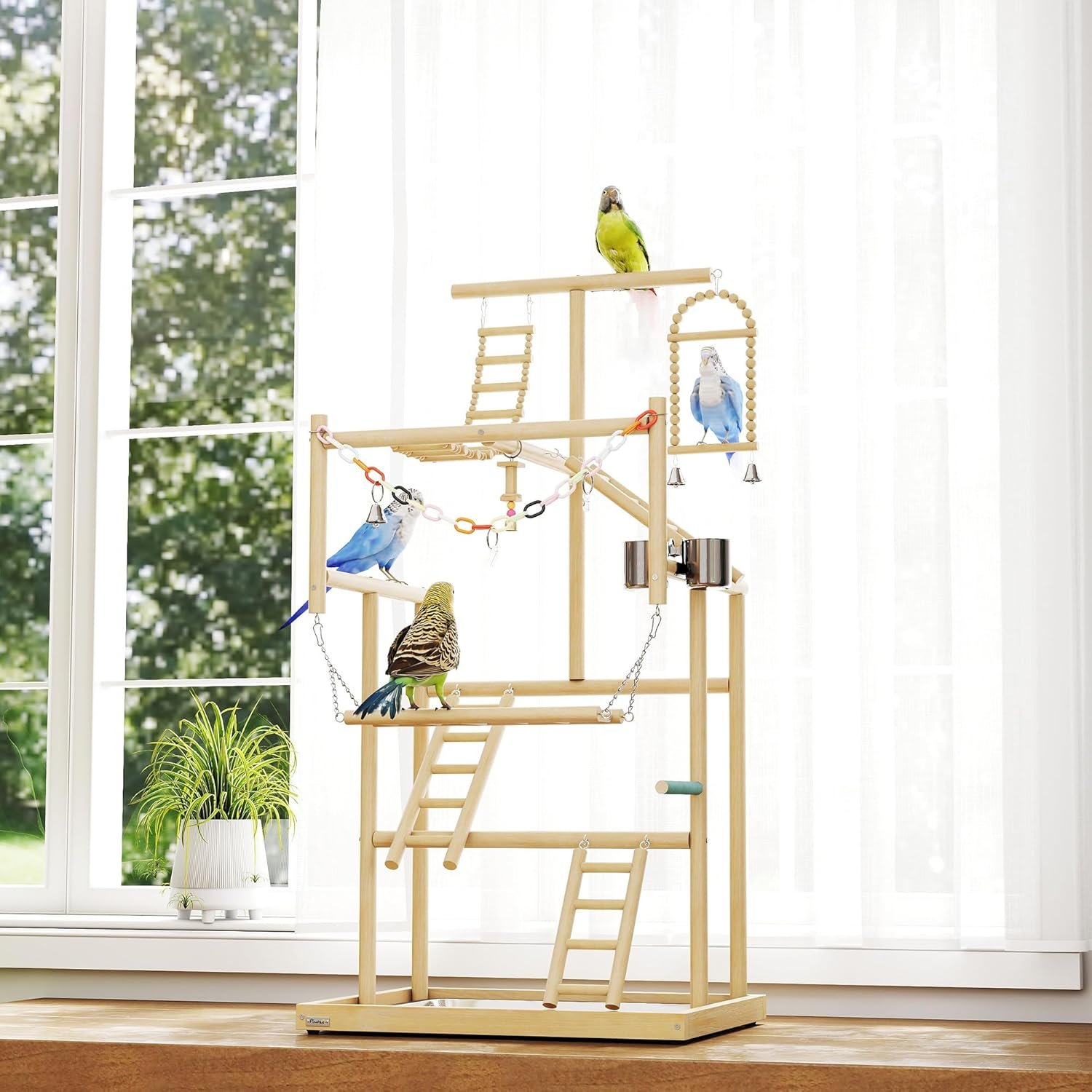 MEHRSCHICHTIGER SPIELBEREICH Ausgestattet mit vier Ebenen ermöglicht dieser Vogelspielplatz Ihren Papageien, aktiv zu bleiben und sich auf natürliche Weise zu bewegen – ideal zum Klettern, Erkunden und Strecken der Flügel, wodurch ihre geistige Stimulation den ganzen Tag über gefördert wird.