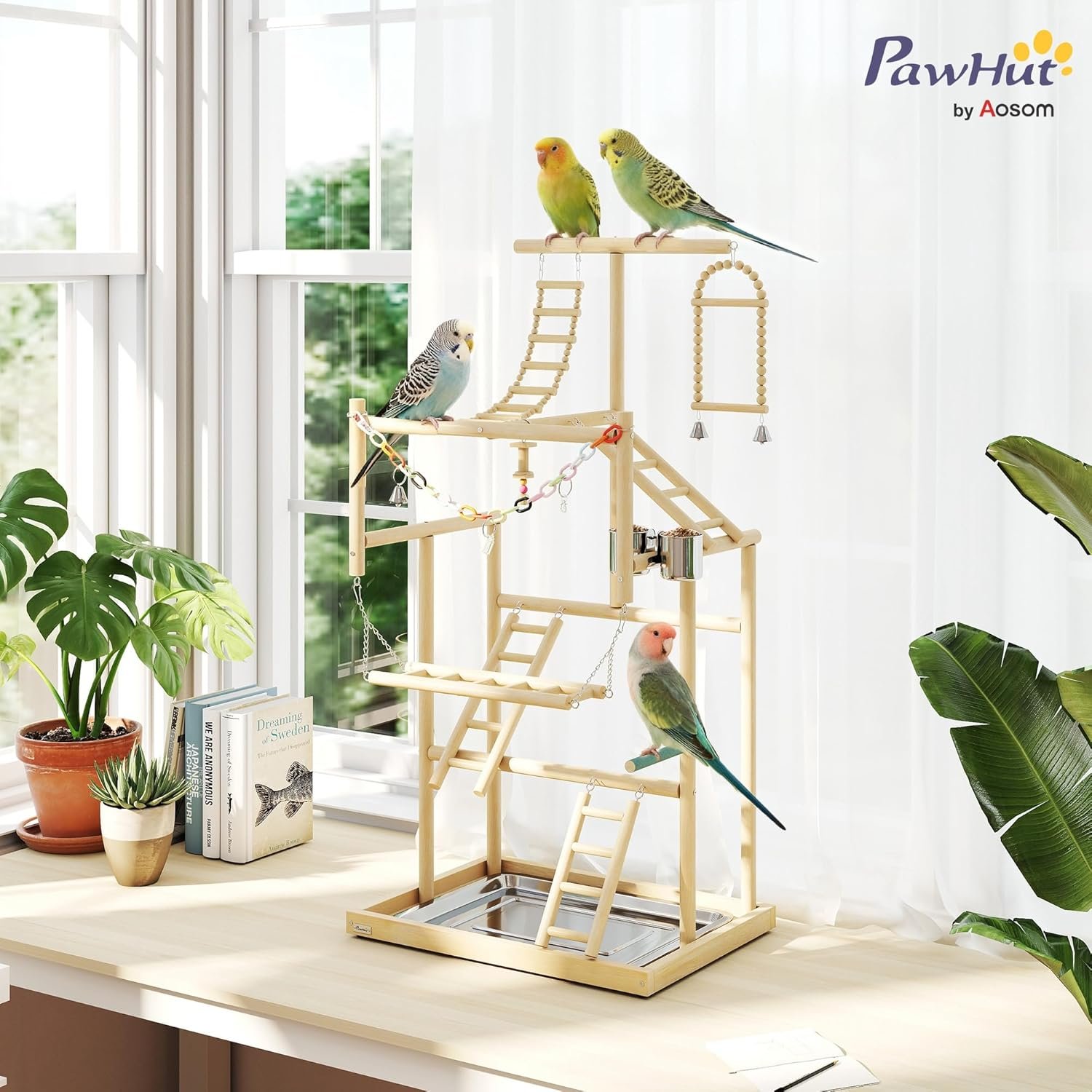 Der PawHut-Vogelspielplatz bietet Vögeln sicheren Spaß. Der Vogelbaum besteht aus poliertem Massivholz mit stabilen Gummifüßen und ist geruchsneutral und bequem. Vier Ebenen mit Leitern, Schaukeln, Futterspendern und Spielzeug fördern die Aktivität. Eine herausnehmbare Edelstahlschale erleichtert die Reinigung. Lässt sich in 30 Minuten zusammenbauen, es ist ideal für Wellensittiche, Nymphensittiche, Sittiche und Turteltauben, der Vogelspielplatz unterstützt die Bewegung und fördert das gemeinsame Spielen.