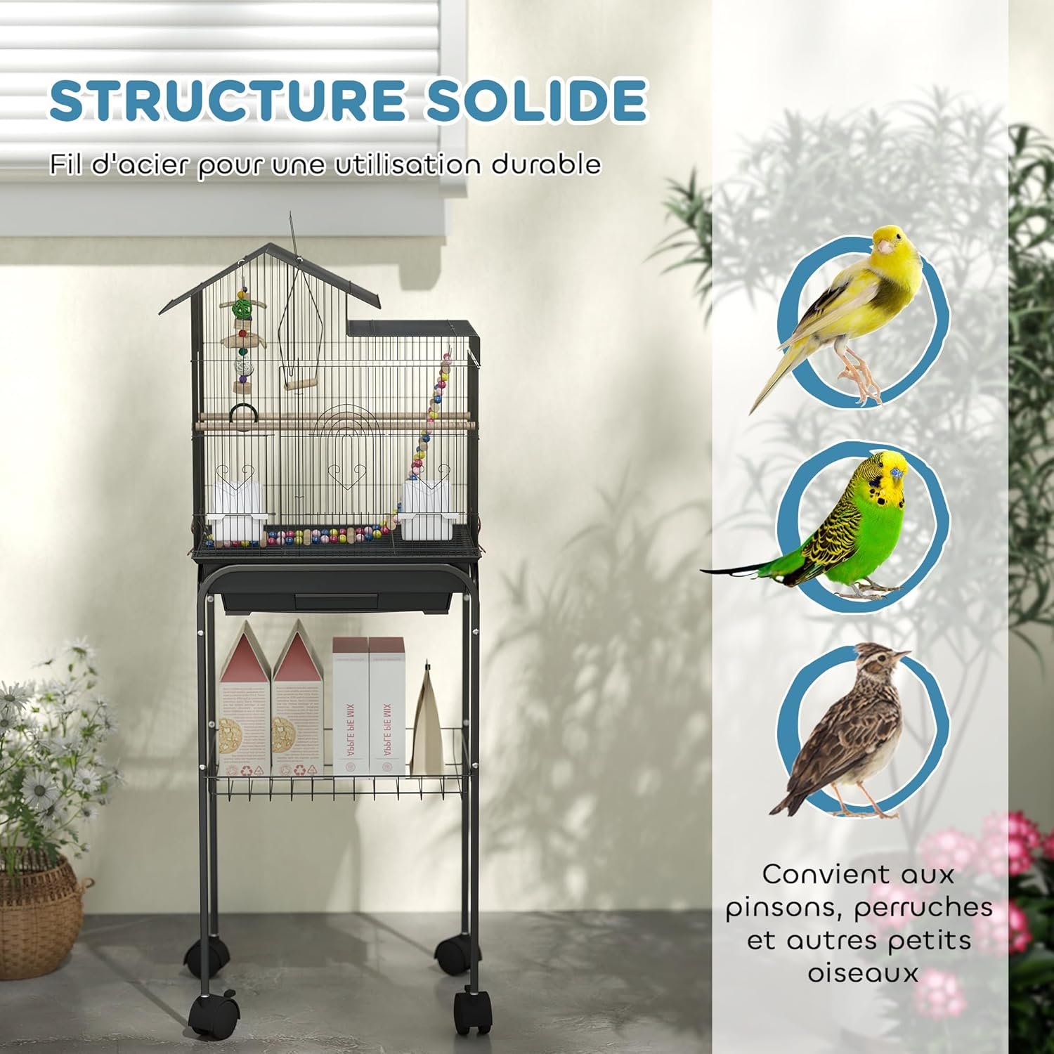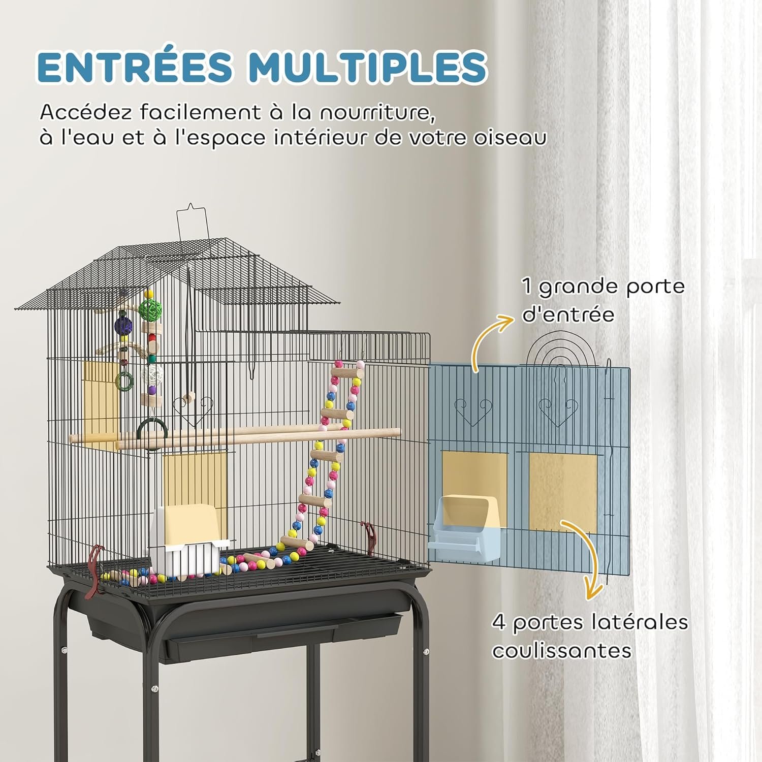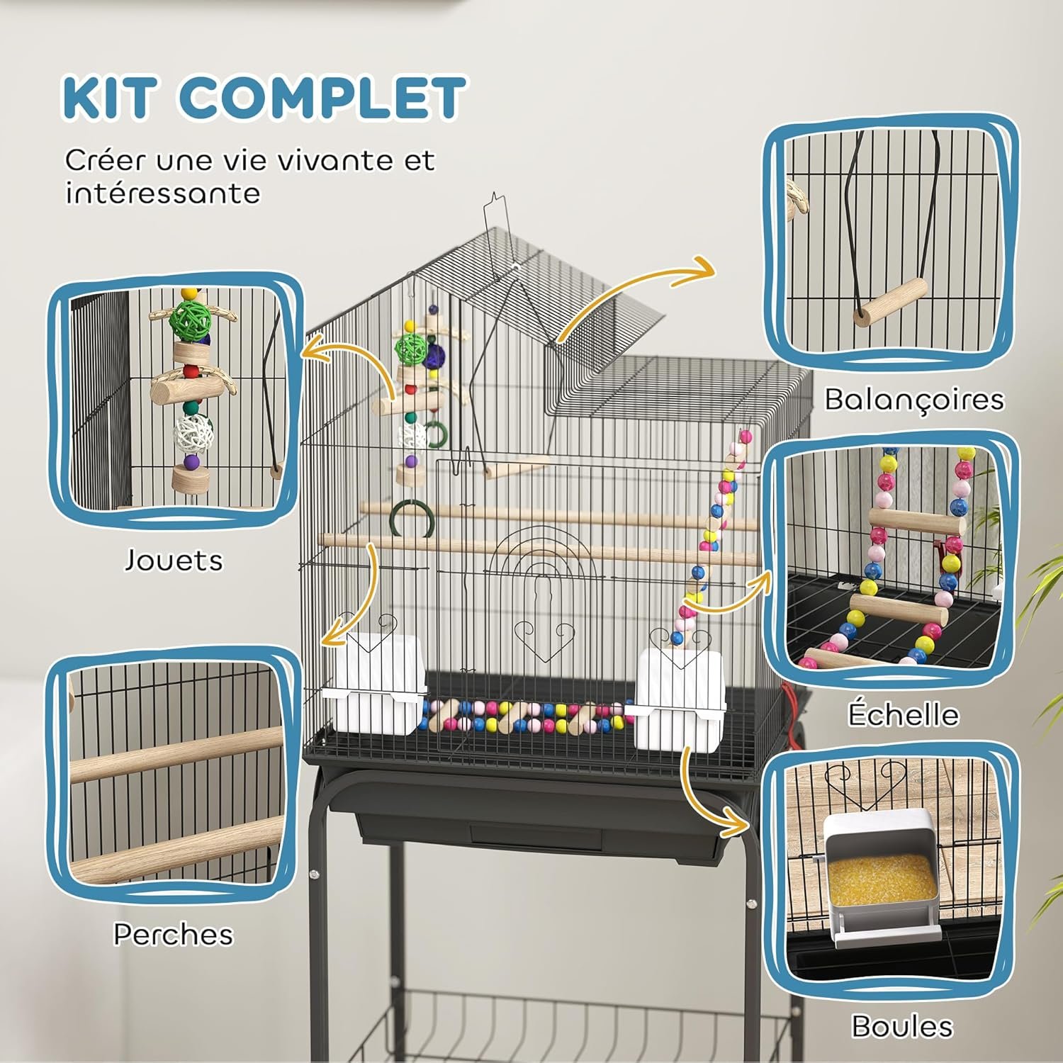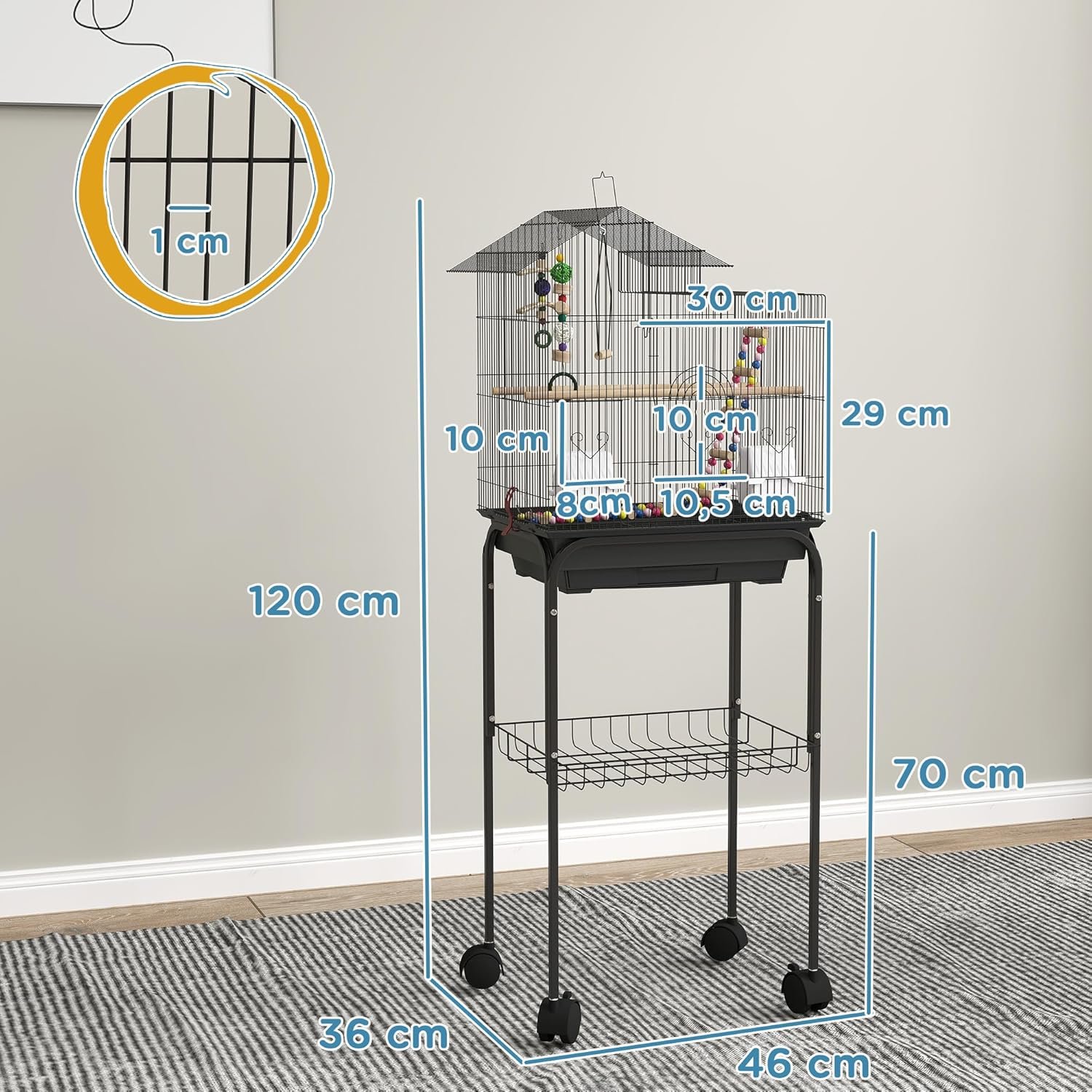 Mit diesem geräumigen Vogelkäfig von PawHut haben Ihre Vögel viel Platz, um sich zu bewegen und ihre Flügel auszubreiten. Das Vogelhaus verfügt über mehrere Sitzstangen zum Ausruhen, eine Schaukel, eine Leiter, Schüsseln für Futter und Wasser sowie lustige Hängespielzeuge. Der obere Griff erleichtert das Tragen, während der mobile Rahmen mit Bremsen es ermöglicht, den Käfig überall hin zu bewegen. Darüber hinaus sorgt die ausziehbare Wanne für eine einfache Reinigung des Käfigbodens.