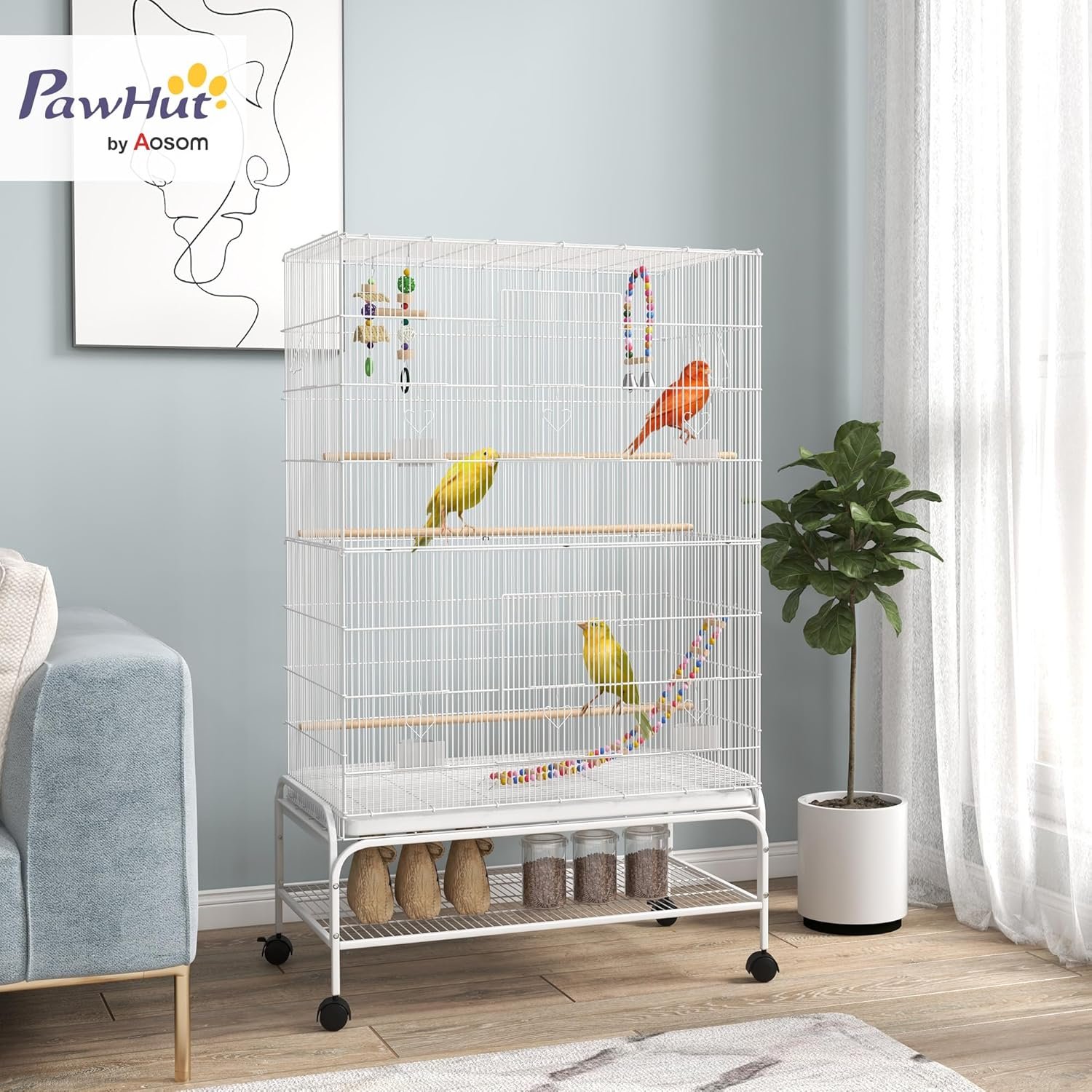 Geräumiger Wohnbereich mit 1 cm Abstand zwischen den Stäben – geeignet für Finken, Kanarienvögel, Wellensittiche, Liebesvögel und mehr Zwei große Türen und acht kleine Türen für einfachen Zugang Enthält drei Holzsitzstangen und vier Plastikfutterbehälter Spielzeug für Vögel bietet Unterhaltung Herausziehbare Schale für einfache Reinigung Vier Räder für müheloses Bewegen, davon zwei Bremsen für festen Halt Unterer Bereich zur Aufbewahrung von Tierbedarf Montage erforderlich