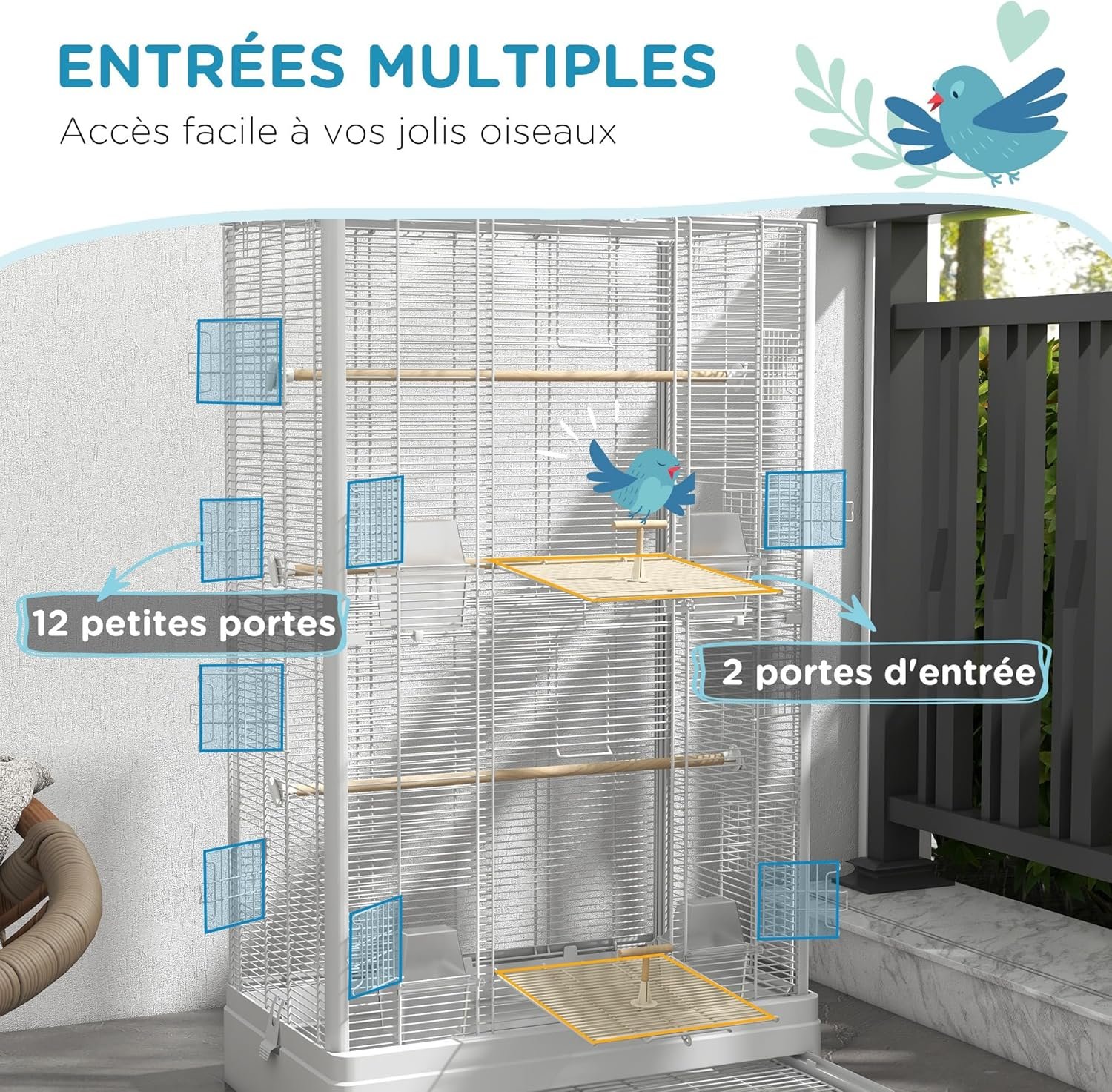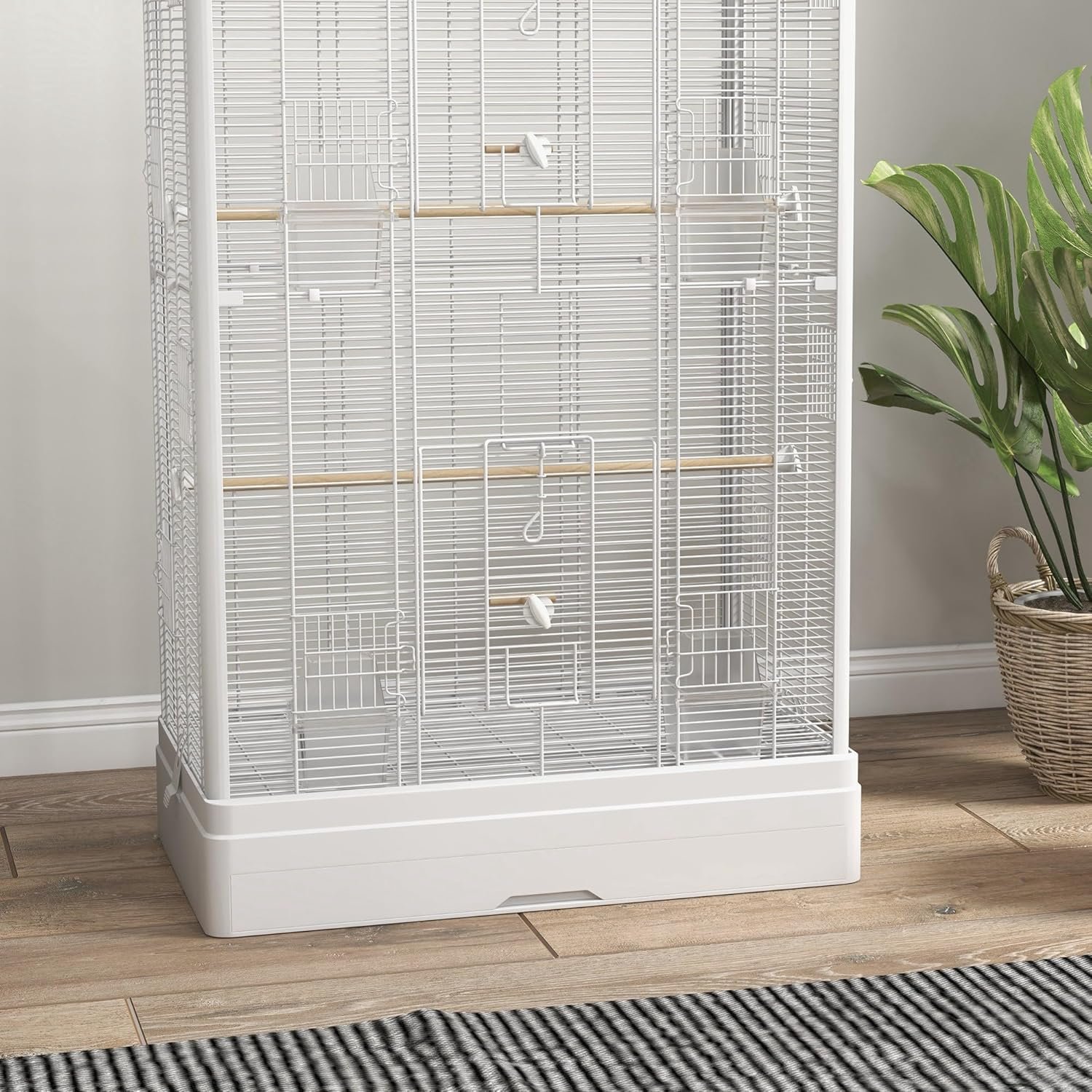 Haben Sie diesen kompakten Vogelkäfig von PawHut gesehen? Diese Voliere verfügt über 5 Sitzstangen (3 große und 2 kleine) und 4 Kunststoffbehälter. Sie ist mit zwei Türtypen ausgestattet: einer großen Tür für einfachen Zugang zum Käfig und kleineren Türen für den direkten Zugriff auf die Wasser- und Futternäpfe.