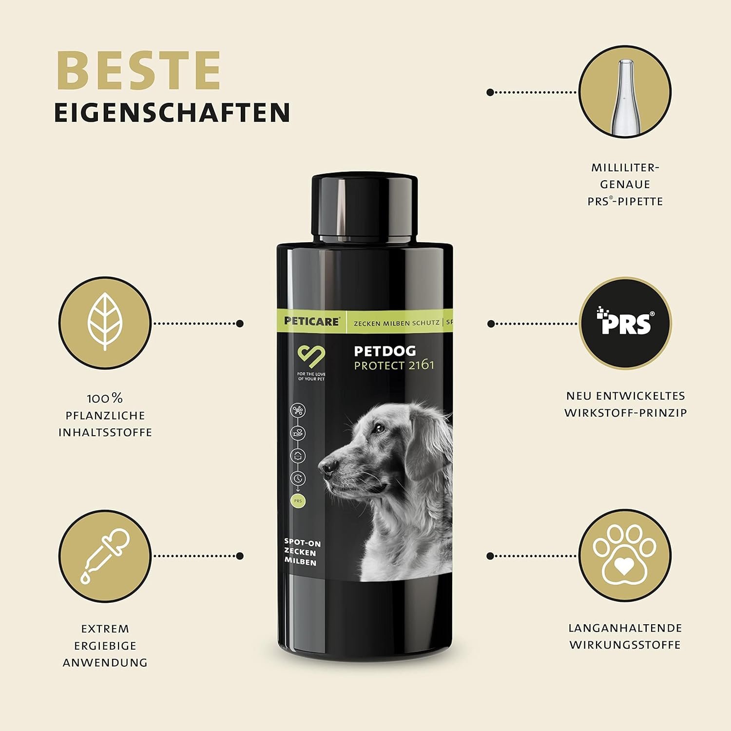 Langanhaltende Wirkung – dank des PRS Peticare Release Systems: Der Spoton gegen Zecken erzeugt eine sehr dünne, poröse und homogene Schicht mit pflanzlichen Wirkstoffen auf der Haut des Hundes. Dank des speziellen PRS Peticare Release Systems werden die Inhaltsstoffe des Mittels langsam und gleichmäßig wie ein Schutzmantel auf der Haut des Hundes abgegeben.