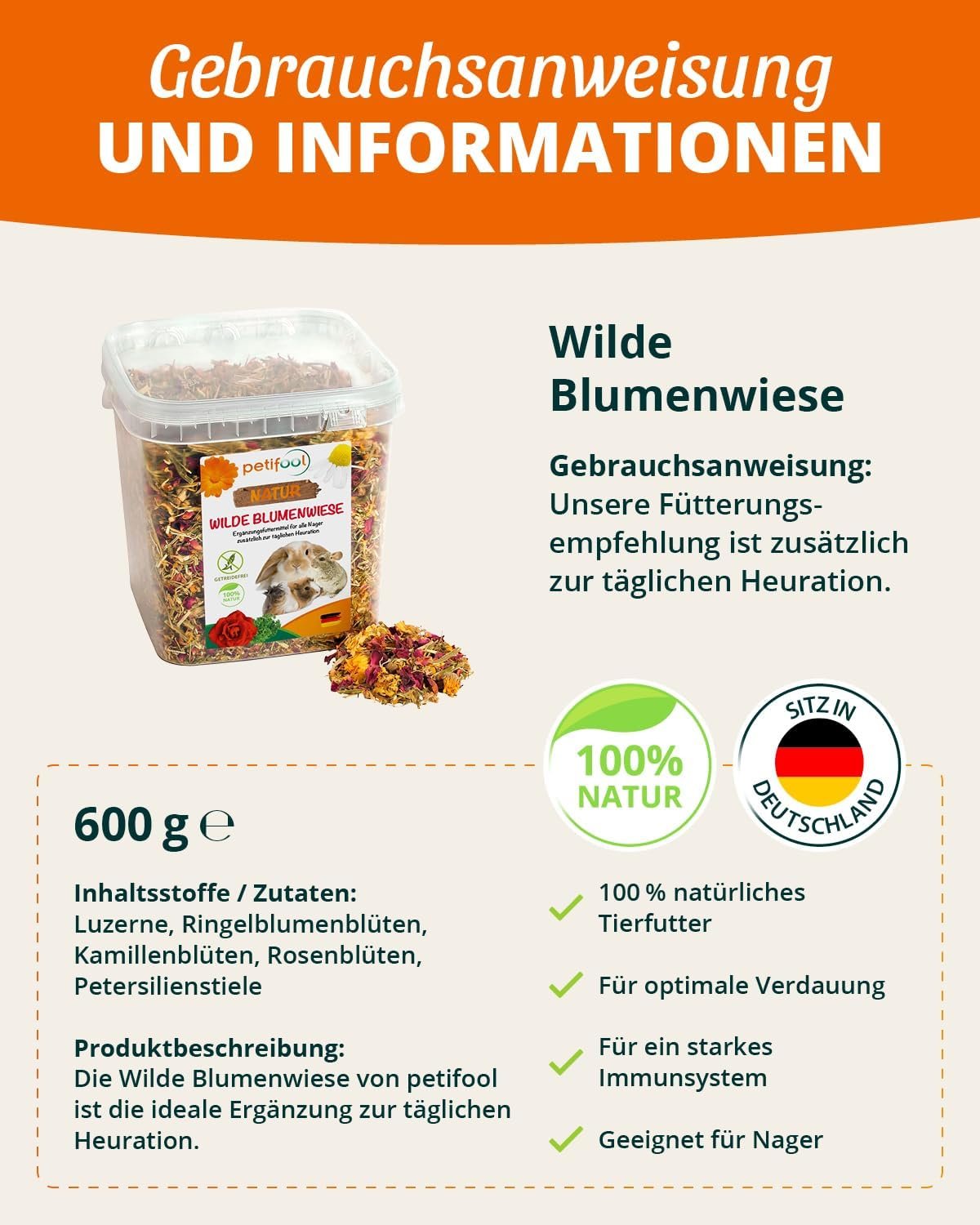 ✔️ 100 % natürlich: Die petifool Wildblumenwiese besteht aus sorgfältig ausgewählten Zutaten wie Luzerne, Ringelblumenblüten, Kamillenblüten, Rosenblütenblättern, Petersilienstängeln.