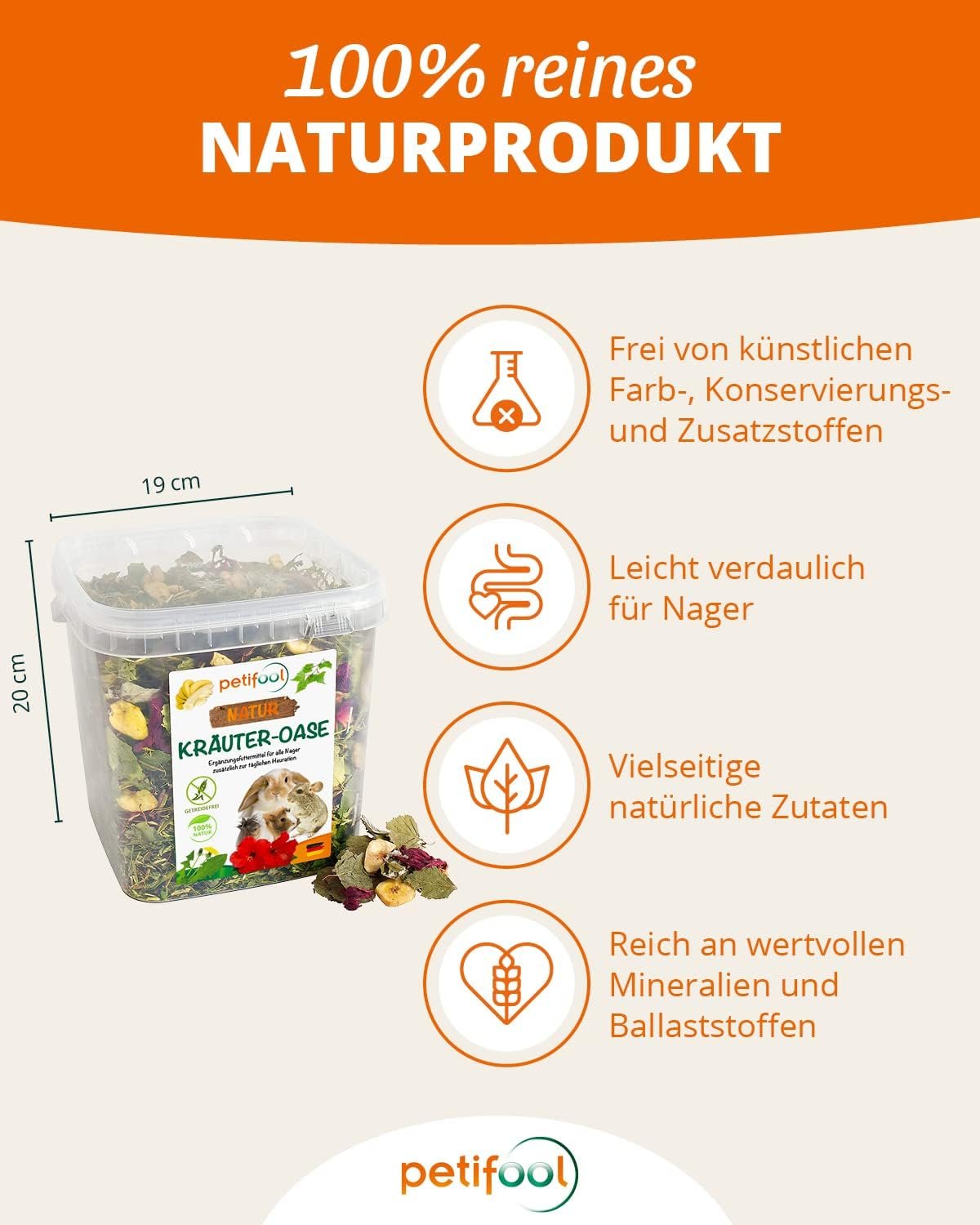 Getreidefrei: Die petifool Kräuter-Oase ist getreidefrei und somit ein leicht verdauliches Ergänzungsfuttermittel für Nager