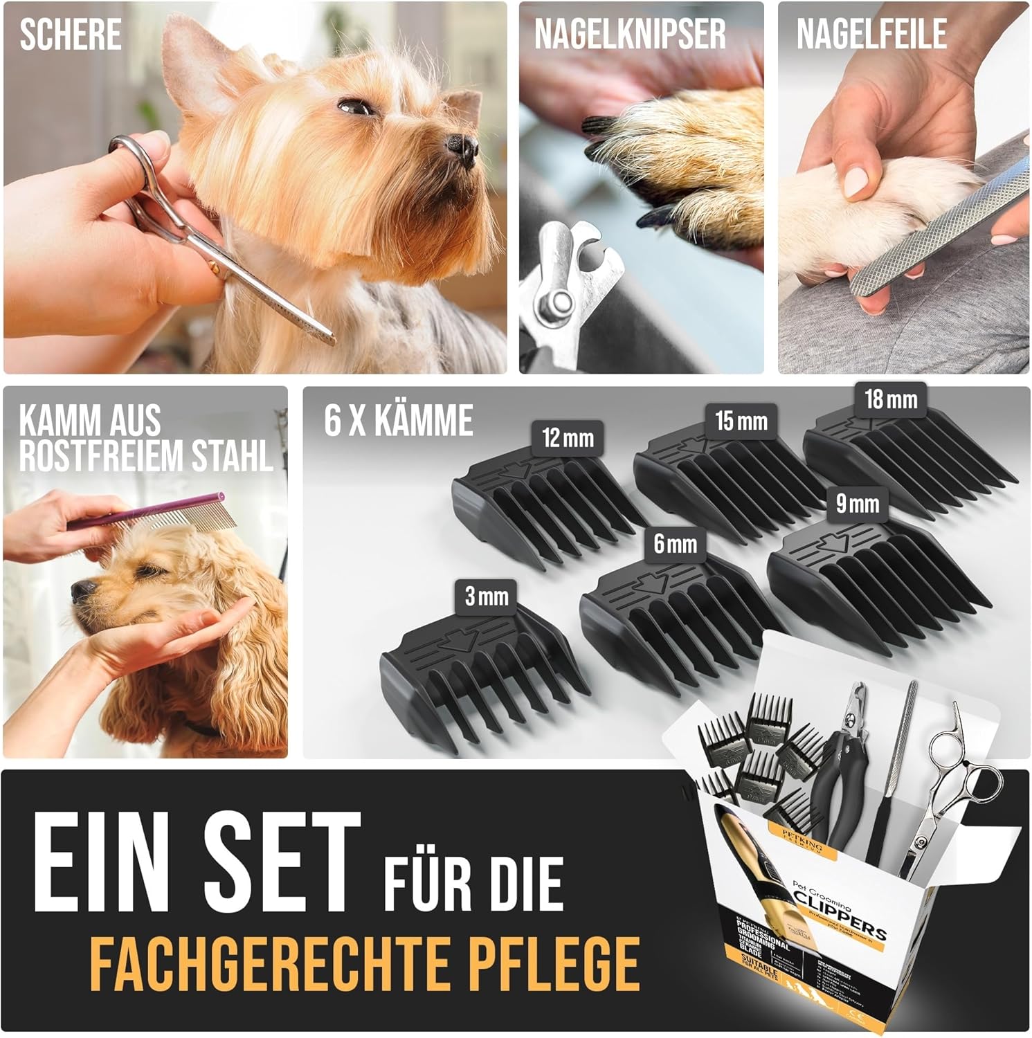 Professionelles Tierhaarschneider-Set für Hunde – Lieferung mit 1 Haarschneidemaschine für Hunde, mit Klinge, 1 x wiederaufladbarer Batterie, 4 x spitzen, abgewinkelten abnehmbaren Kammaufsätzen/Führungskämmen, 1 x Reinigungsbürste, Edelstahlschere, 1 x Edelstahlkamm, 1 x Nagelknipser, 1 x Nagelfeile, 1 x Bedienungsanleitung. sogar das dicke Fell