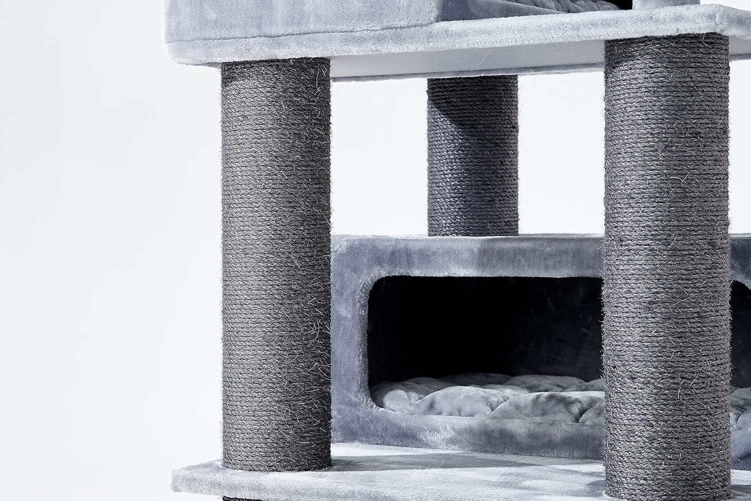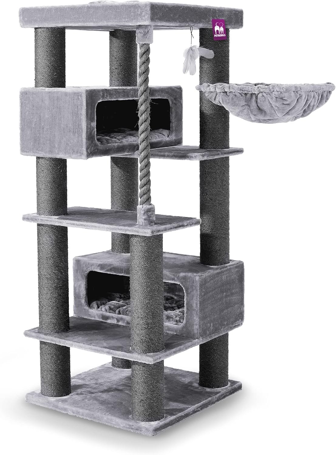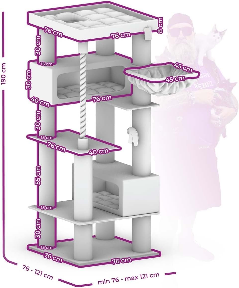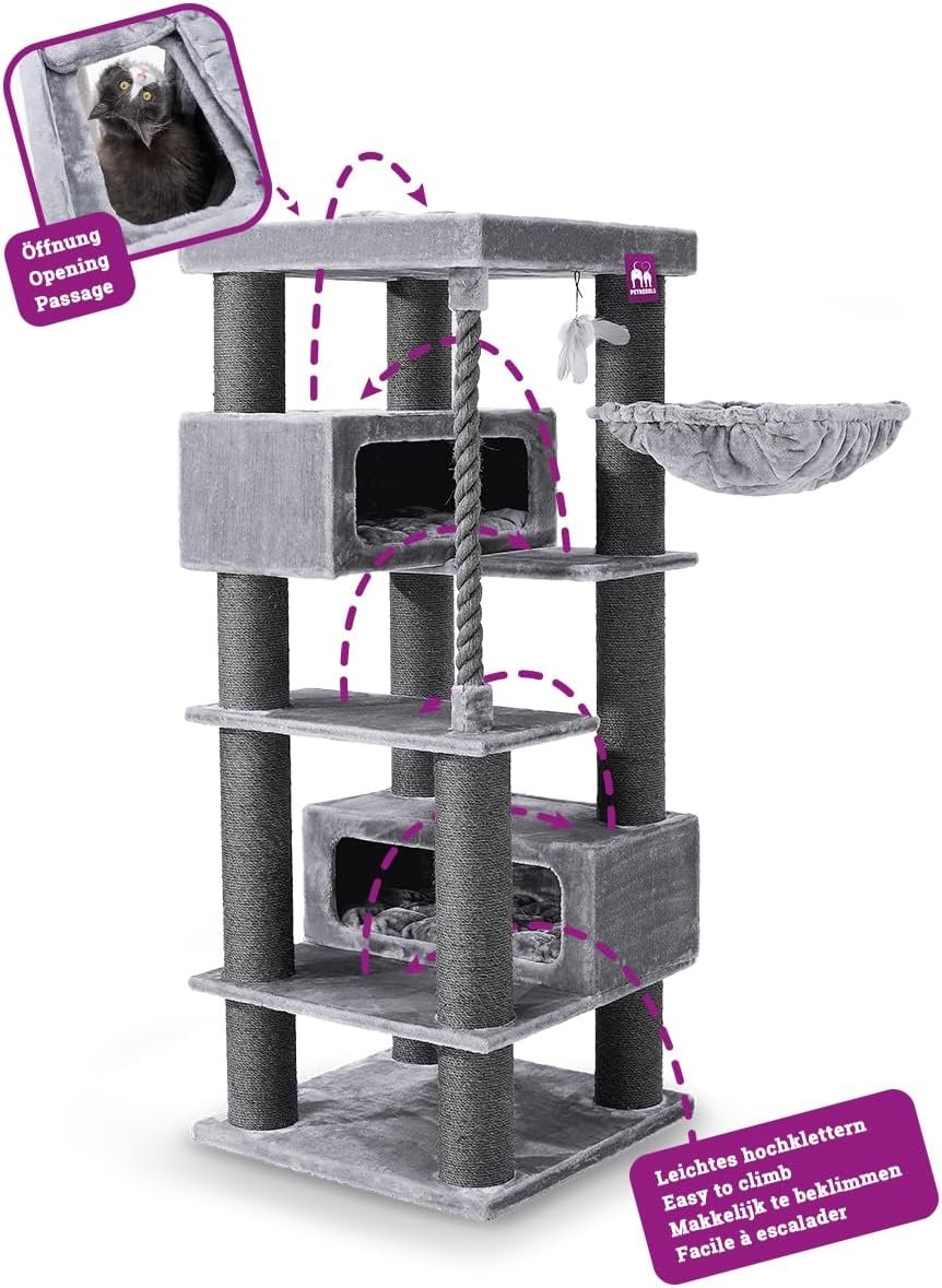 Extrem stabil – Kratzbaum mit XL-Hängematte, 2 XXL-Schlafhöhlen, Relax-Top-Sofa mit Kissen, Sisal-Spielseil und extra dicken 15 cm Sisalstämmen