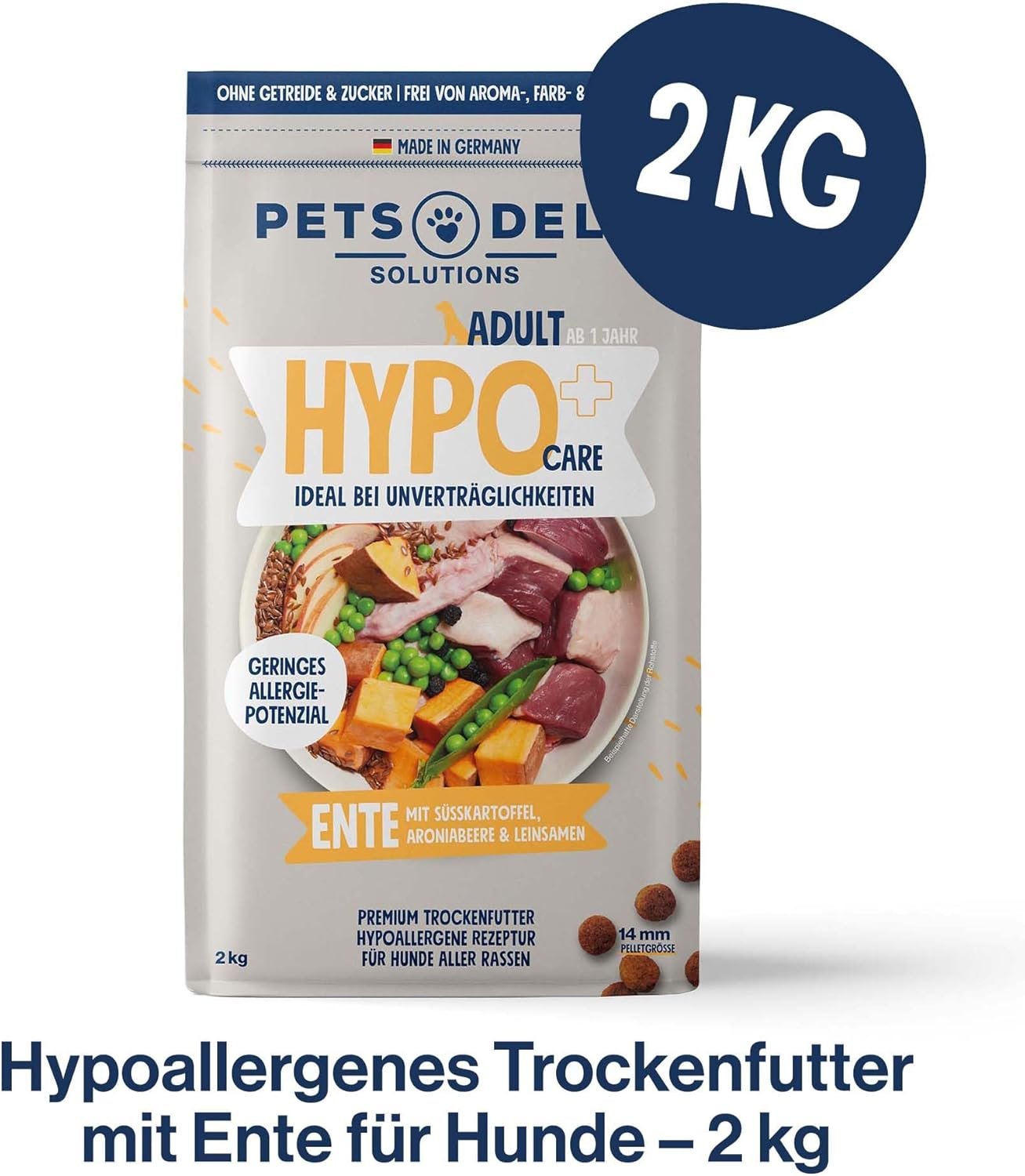 Pets Deli Hypocare Duck Trockenfutter für Hunde mit Süßkartoffel, Aroniabeere und Leinsamen – ohne Zucker und Gluten, 2 kg