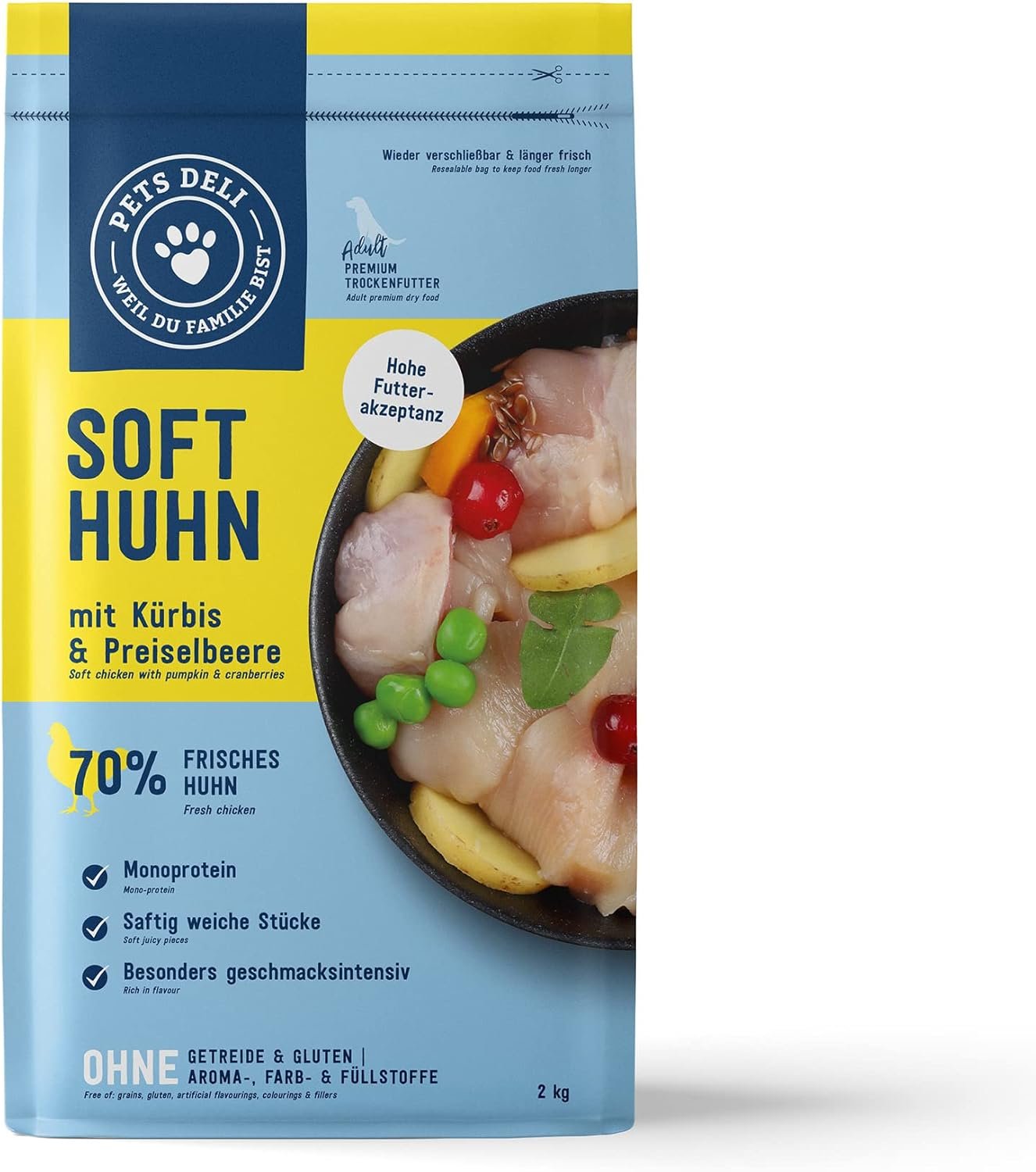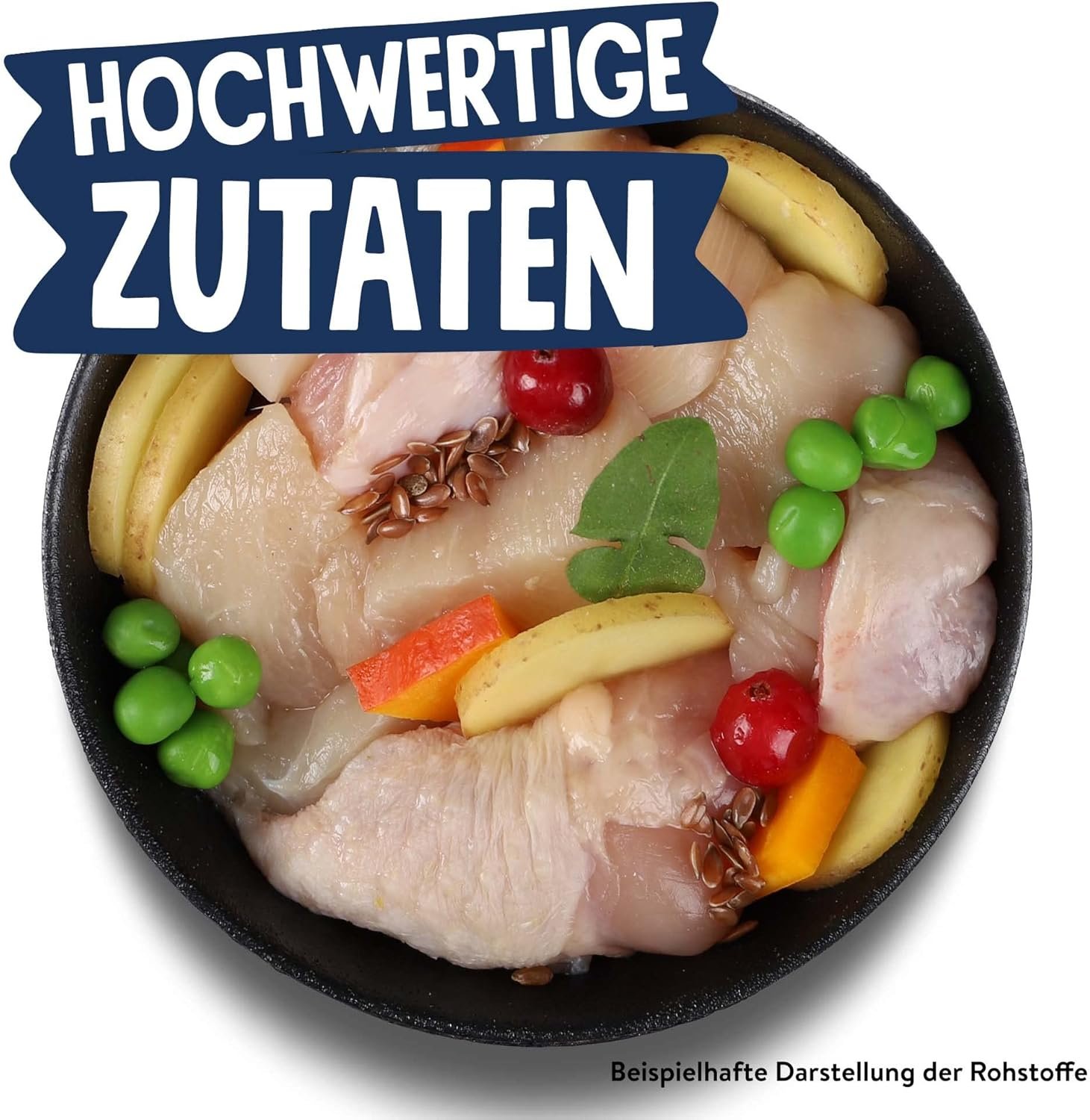 Zusammensetzung: 70,0 % frisches Huhn, 13,0 % Kartoffeln, 4,0 % Kürbis, 2,0 % Erbsen, Hühnerprotein, 2,0 % Rübentrockenschnitzel (entzuckert, wertvolle Ballaststoffquelle), Geflügelfett, Hühnerprotein (hydrolysiert), 0,1 % Chicorée (natürliche Quelle wertvoller), 0,1 % Leinsamen, 0,1 % Bierhefe (natürliche Vitamin-B-Quelle), 0,1 % Cranberry, 0,1 % Löwenzahn, 0,05 % Glucosamin¹, 0,05 % Chondroitinsulfat¹