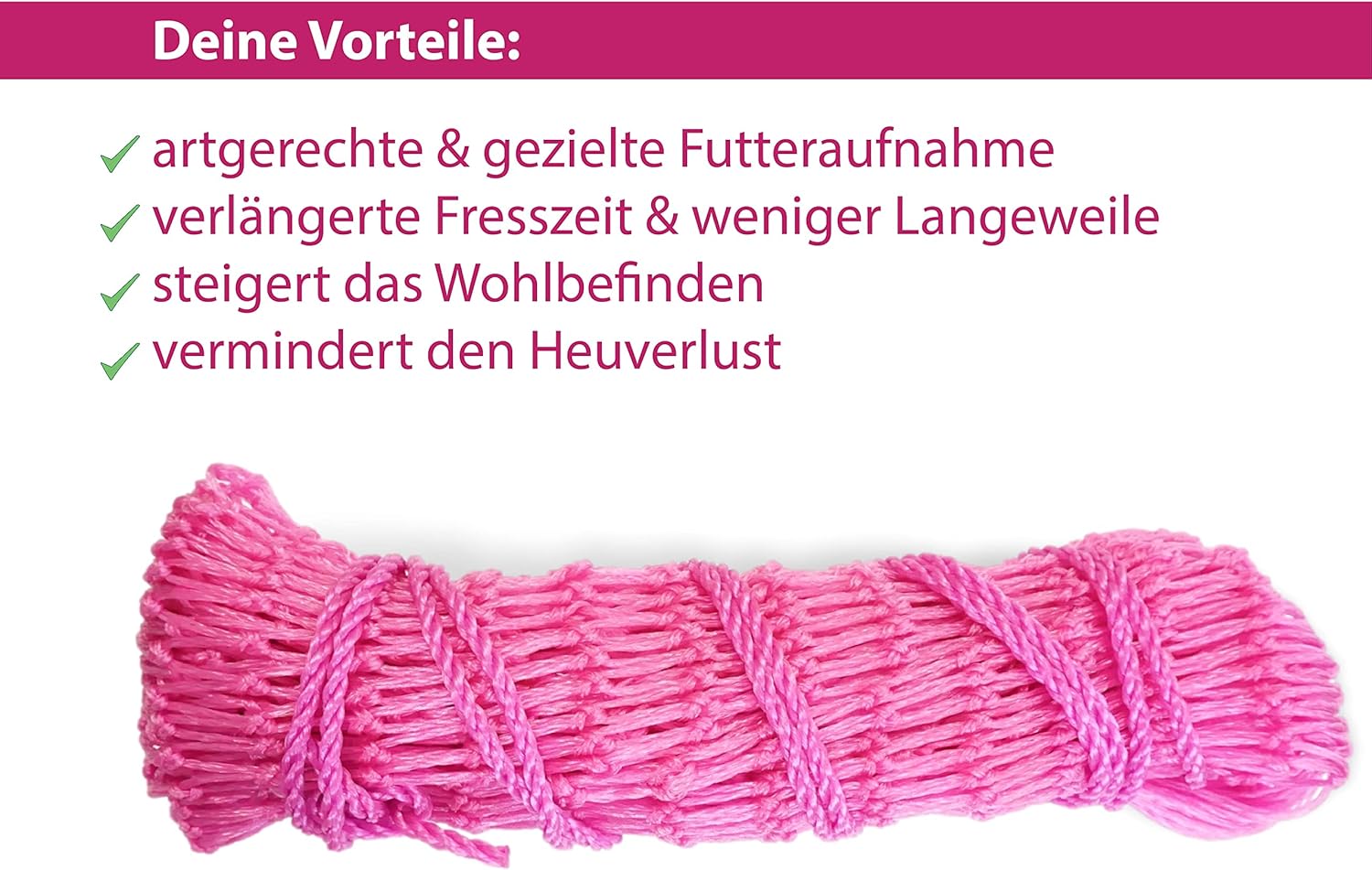 Die ideale Pferdebeschäftigung: Durch den Einsatz des engmaschigen Heunetzes 3 x 3 erhält das Pferd über den Tag verteilt kleine Heumengen, was zu einer verbesserten Verdauung, mehr Wohlbefinden, weniger Langeweile führt.