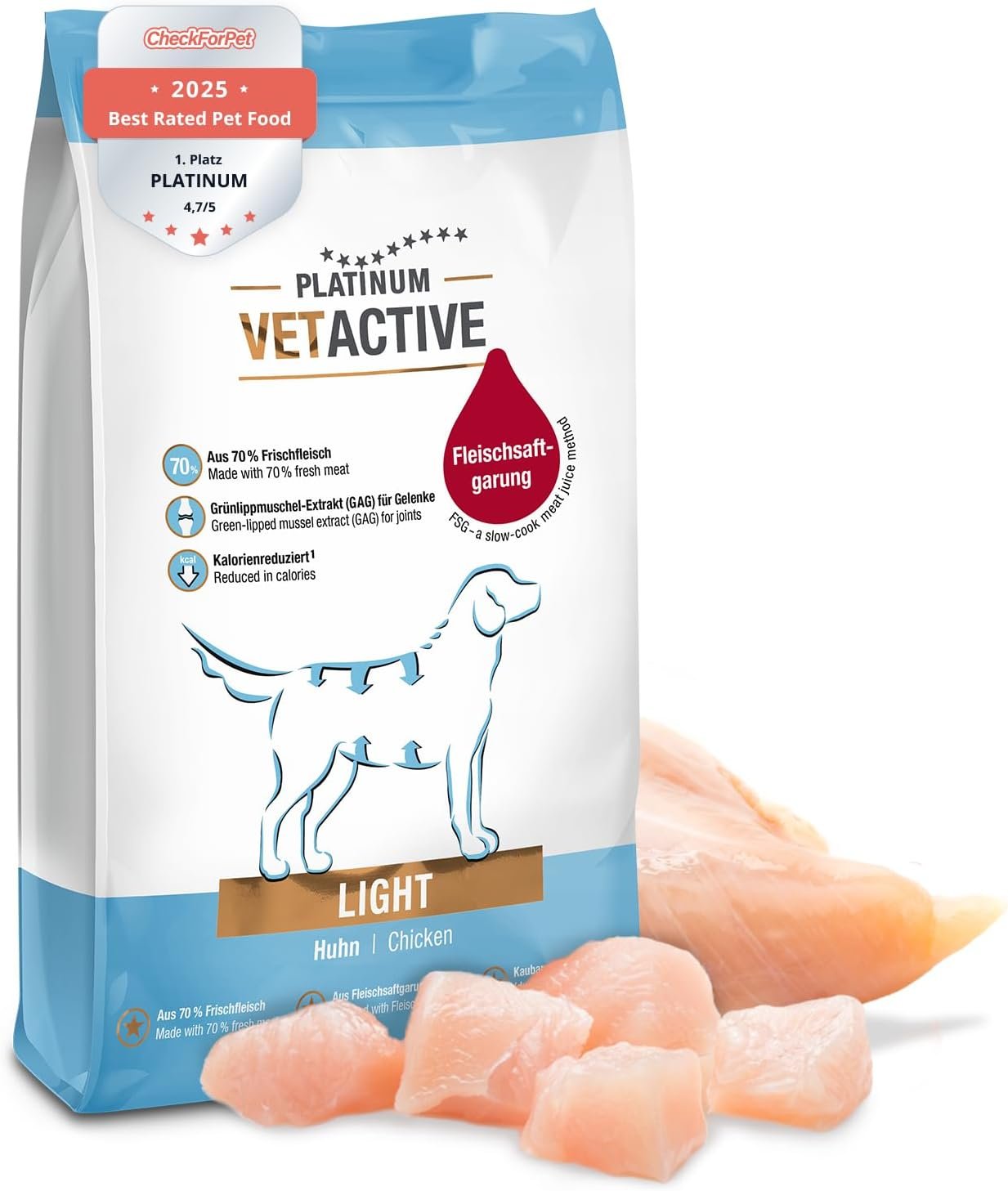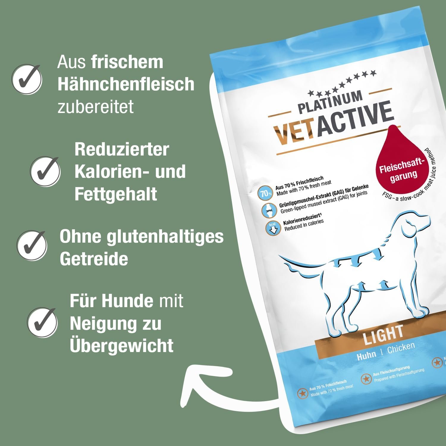 UNTERSTÜTZUNG – Unser VETACTIVE Light Hundefutter mit reduziertem Kalorien- und Fettgehalt unterstützt Hunde mit Neigung zu Übergewicht bei der Gewichtserhaltung und -reduzierung.