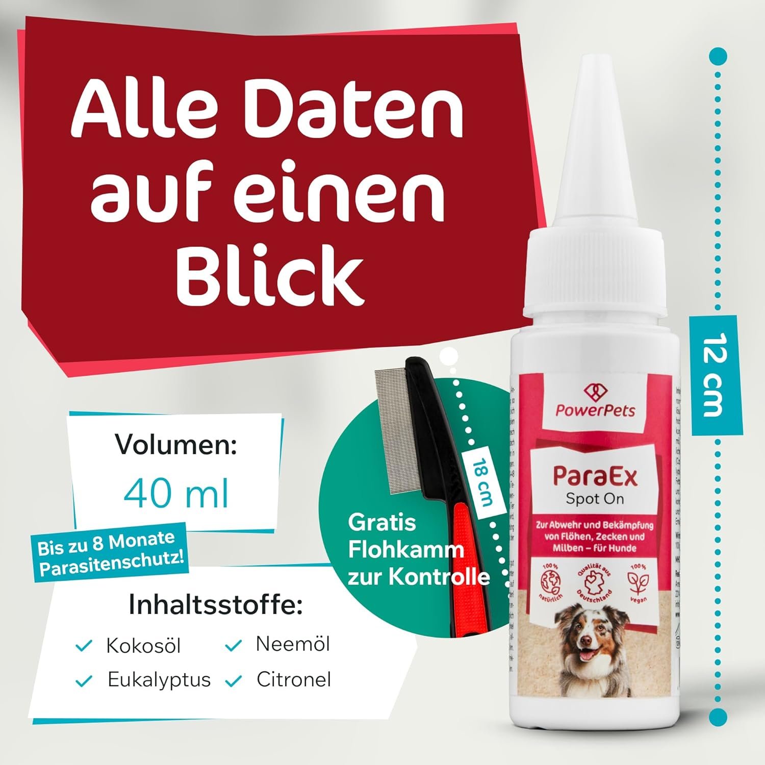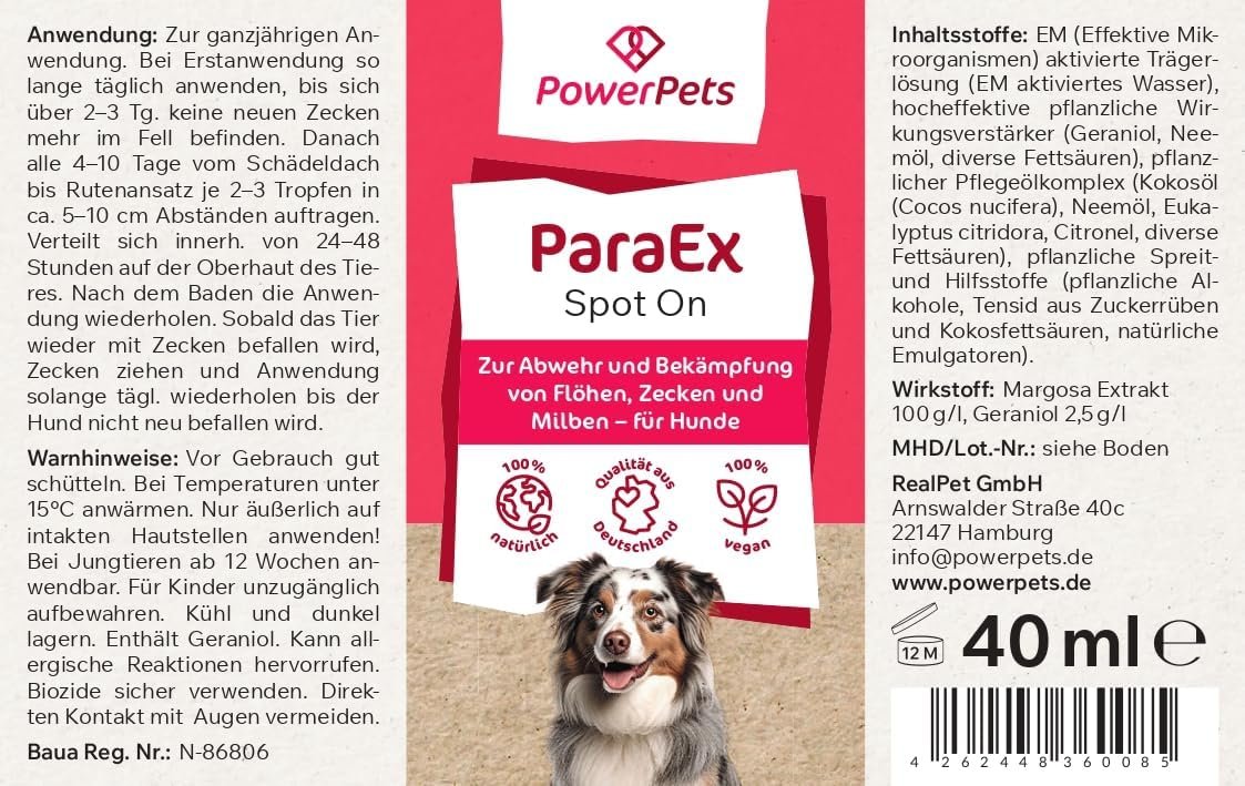100 % natürliche Inhaltsstoffe. „Speichelfluss“ oder andere besorgniserregende Nebenwirkungen gehören nun der Vergangenheit an. Schützen Sie Ihr Tier mit der Kraft der Natur vor Parasiten wie Flöhen oder Zecken. Tun Sie Ihrem Haustier etwas Gutes und verzichten Sie auf giftige Chemikalien, damit Sie und Ihr bester Freund ein sorgenfreies Leben ohne Zecken und Flöhe führen können. Darüber hinaus verfügen Sie über ein Produkt, das bei empfohlener Anwendung bis zu 12 Monate hält.