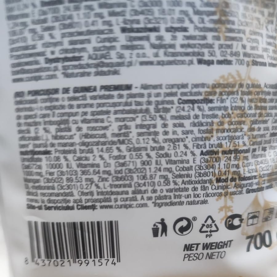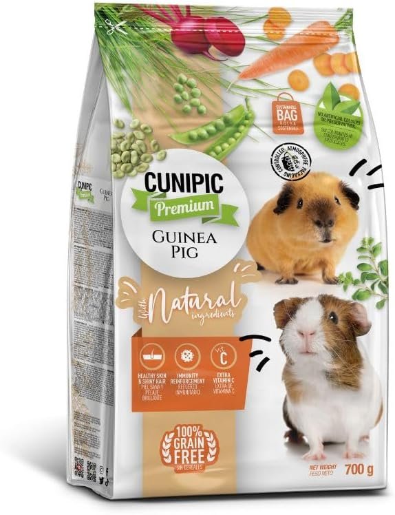 Cunipic Premium Meerschweinchenfutter ist ein sehr schmackhaftes, vollständiges und ausgewogenes Futter, das speziell für Meerschweinchen jeden Alters und jeder physiologischen Verfassung entwickelt wurde. Eines der Hauptmerkmale dieses Produkts ist, dass es zu 100 % getreidefrei ist, was es zur idealen Wahl für Meerschweinchen mit Nahrungsmittelunverträglichkeiten macht. Dieses Futter wurde entwickelt, um das Immunsystem von Meerschweinchen zu stärken, dank seiner Kombination essentieller Nährstoffe, die eine garantierte Zufuhr von Vitamin C enthalten, das für ihre Gesundheit unerlässlich ist, da sie es nicht selbst synthetisieren können. Zusätzlich zu seiner Nährstoffversorgung trägt dieses Futter durch die darin enthaltenen Fettsäuren zur Gesundheit des Meerschweinchenfells bei. Dies sorgt für kräftiges, weiches und glänzendes Haar. Es fördert außerdem eine gesunde Verdauung und beugt so häufigen Verdauungsproblemen bei Meerschweinchen wie Verstopfung und Durchfall vor. Ein weiterer Vorteil des CUNIPIC Premium Meerschweinchenfutters besteht darin, dass es zur Erhaltung gesunder und starker Knochen und Muskeln beiträgt, was besonders für junge Meerschweinchen und erwachsene Meerschweinchen wichtig ist. Darüber hinaus hilft sein geringer Fettgehalt, Fettleibigkeit vorzubeugen. Um die Frische des Produkts zu gewährleisten, werden diese Lebensmittel in einer modifizierten Atmosphäre verpackt, was bedeutet, dass die Luft aus dem Inneren entfernt und durch eine Gasmischung ersetzt wurde, die zur Erhaltung der Nährstoffe beiträgt. Es ist auch wichtig zu betonen, dass dieses Produkt keine künstlichen Farb- oder Konservierungsstoffe enthält, was es zu einer gesunden und natürlichen Wahl für Ihr Haustier macht.
