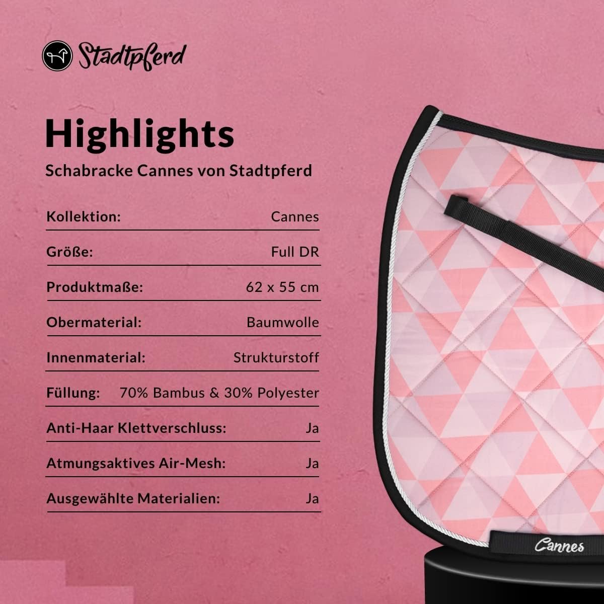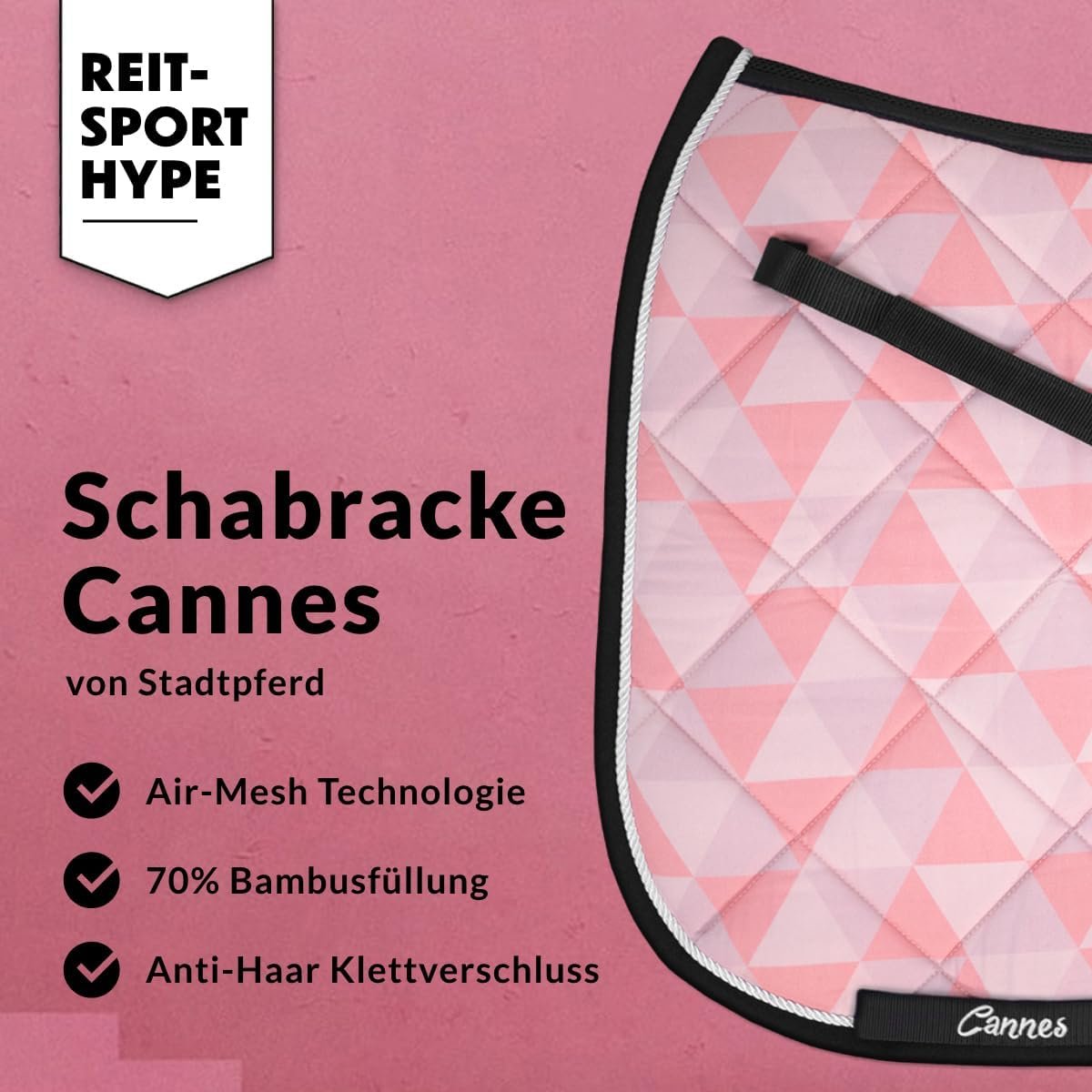 Premium-Schabracke Cannes ✓ Air-Mesh-Technologie ✓ Füllung 70 % Bambus & 30 % Polyester ✓ Anti-Haar-Klettverschluss • Schabracke Dressur – Schabracke Pferd – Schabracken-Set – Schabracke Rosa