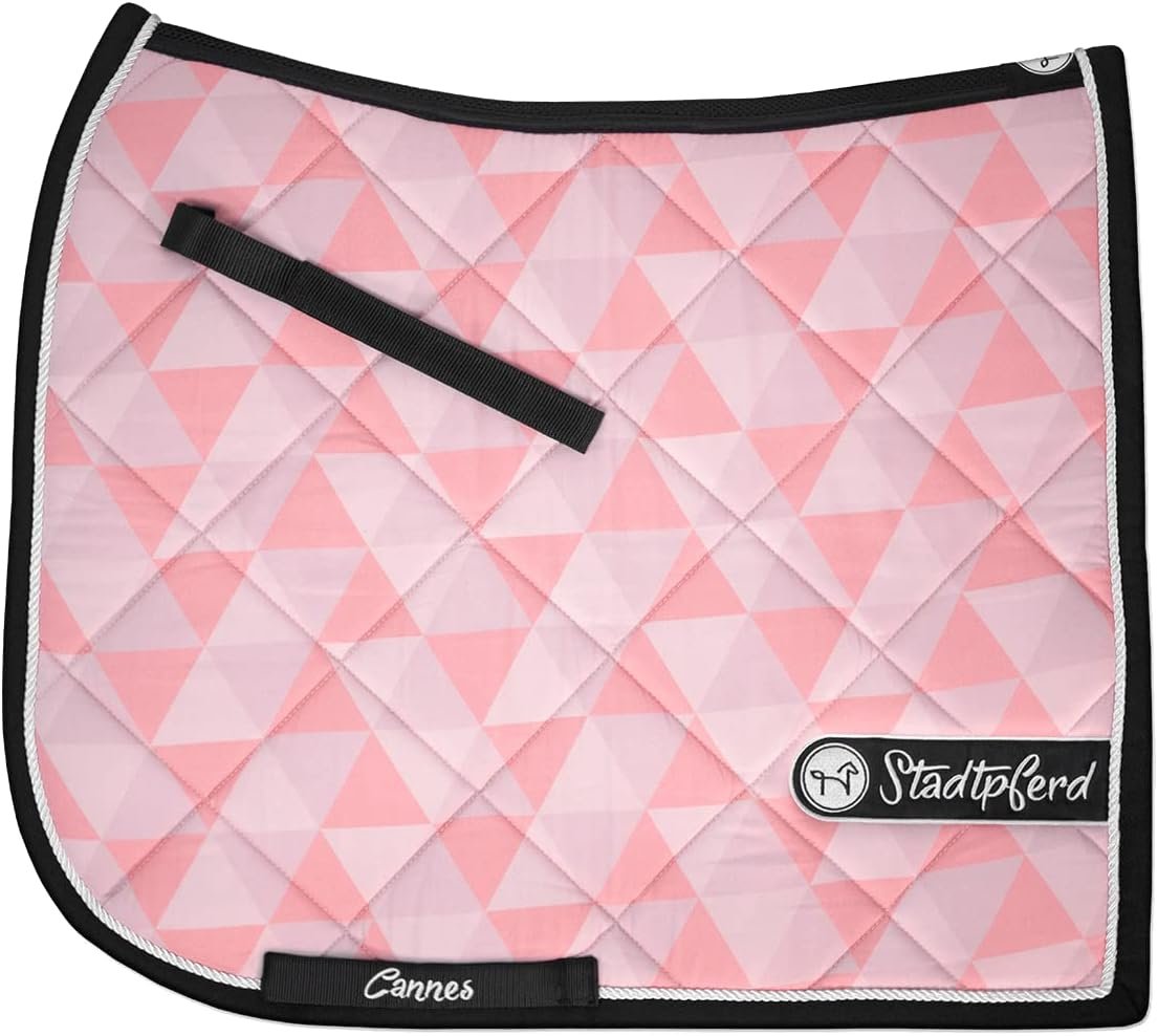 Premium-Satteldecke: Sommer, Sonne – die Schabracke Cannes. Das außergewöhnliche Design kombiniert warme Pastelltöne mit geradlinigen geometrischen Formen. Ein Druck, der an die atemberaubende Aussicht auf die unzähligen rosa Sonnenschirme der traumhaften Sandstrände an der Côte d’Azur erinnert. Cannes bringt dein Stadtpferd zum Strahlen. Holen Sie sich jetzt den Sommer auf Ihr Pferd – das ganze Jahr über.