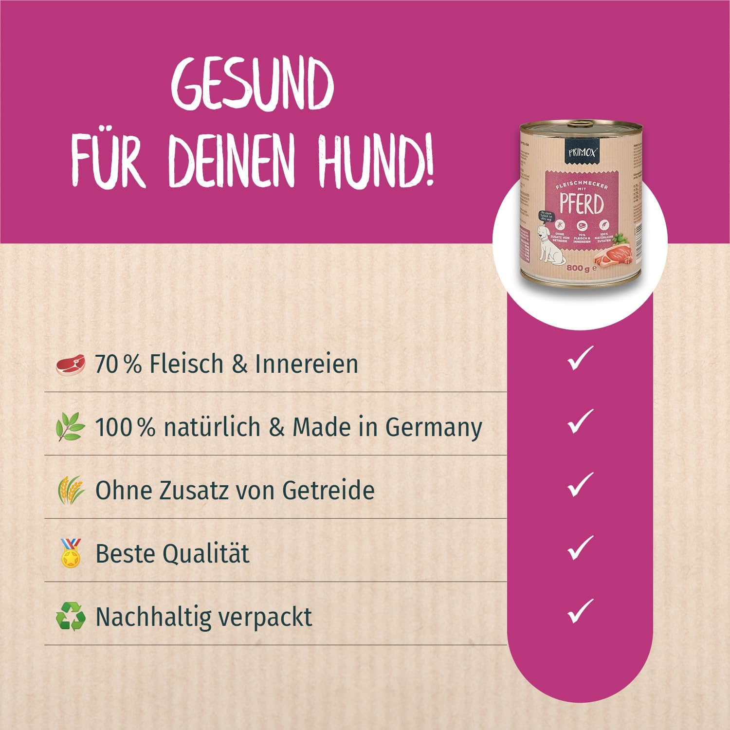 PRIMOX Fleischmecker mit Pferd ist eine ausgewogene Mahlzeit mit 100% natürlichen Zutaten, 70% Fleisch und Innereien sowie einer optimalen Nährstoffzusammensetzung aus Proteinen, Fetten und Ballaststoffen, die deinen Hund optimal versorgen. Produziert in Deutschland aus hochwertigen Rohstoffen, ohne Zusatz von Getreide, Zucker, Aroma- oder Farbstoffen. Ideal für Hunde aller Rassen und Größen. Nachhaltig verpackt und von Fressperten empfohlen.