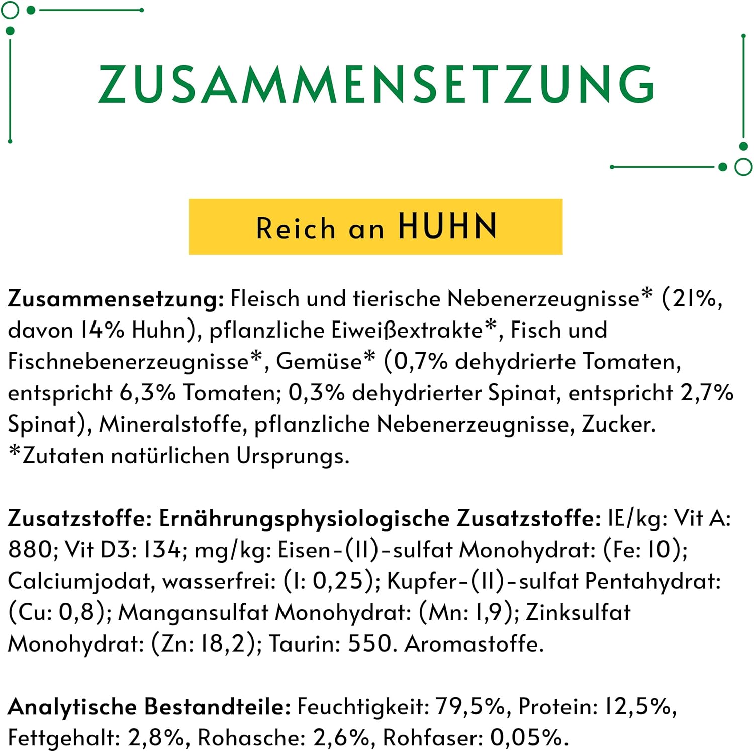 Nassfutter für Katzen mit natürlichen Zutaten – reich an Huhn, mit feiner Gemüsebeilage aus Spinat und Tomaten, 12 x 85 g