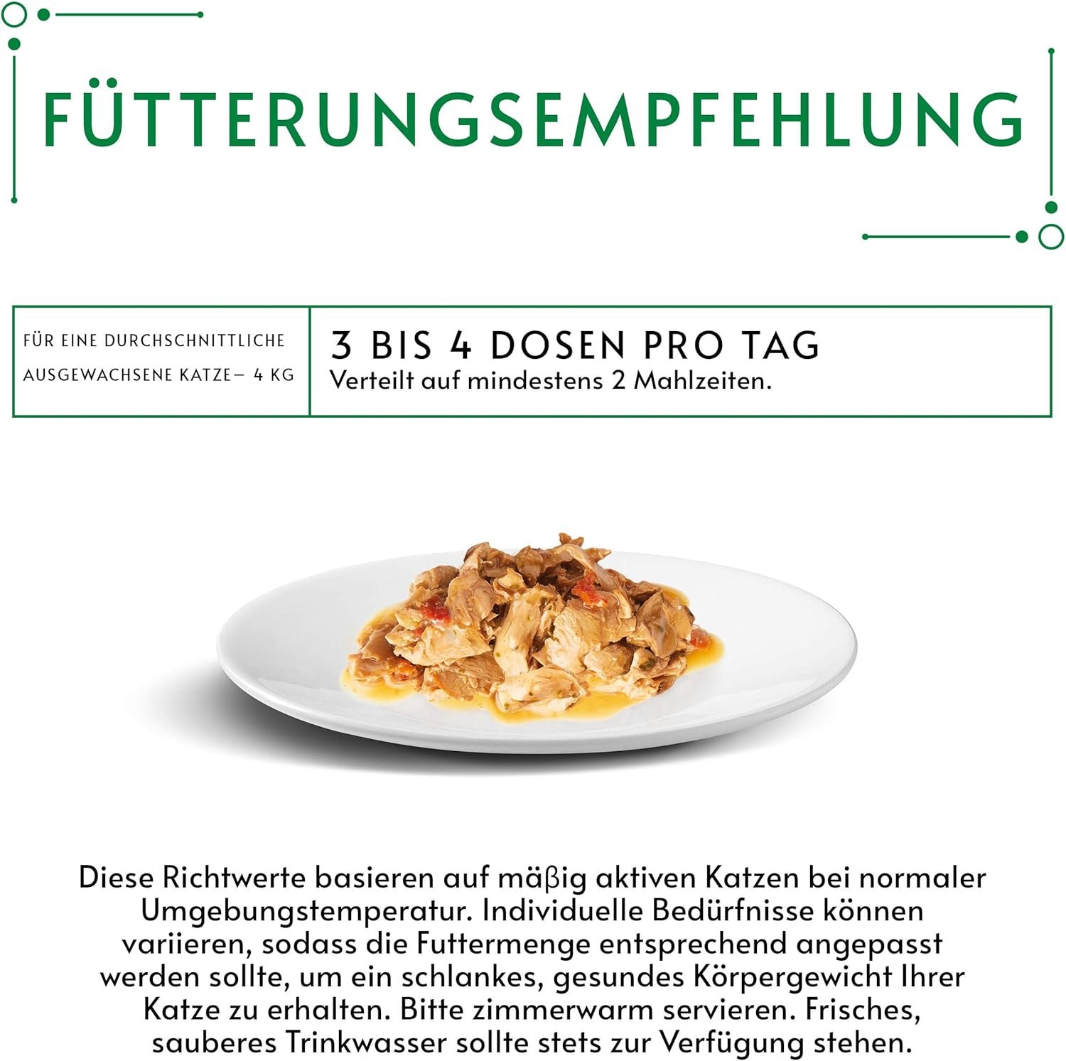 Fütterungsempfehlung: Für ausgewachsene Katzen entnehmen Sie bitte die genauen Fütterungshinweise der Verpackung