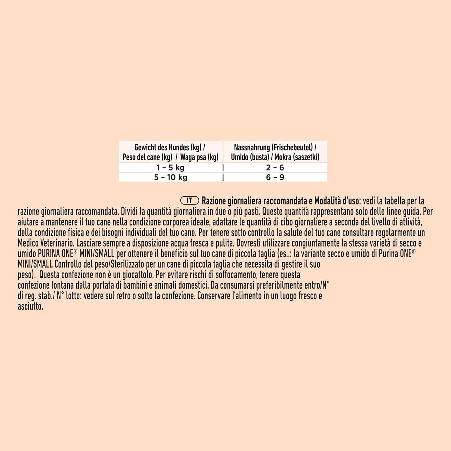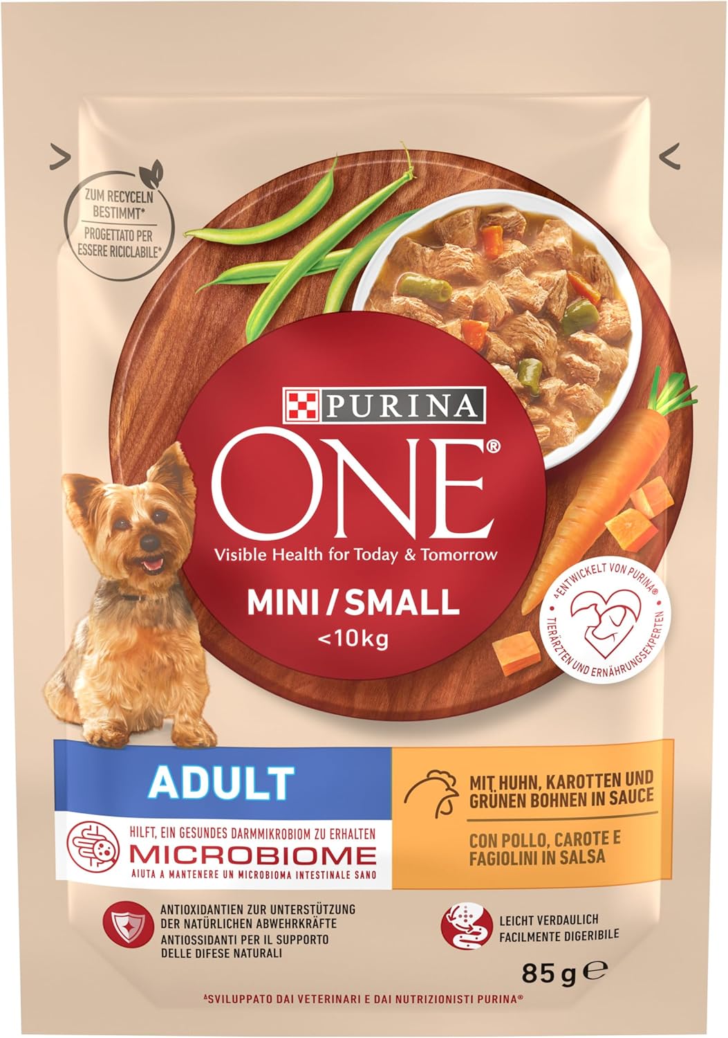 PURINA ONE Mini/Small Adult – Nassfutter für kleine Hunde PURINA ONE Mini Adult ist eine schmackhafte Formel mit Huhn, die reich an Proteinen ist und Ihren kleinen Hund mit der Energie versorgt, die er braucht. Unser Nassfutter richtet sich insbesondere an kleine Hunderassen unter 10 kg. • Nassfutter in Soße für kleine Hunde ab 1 Jahr • Hundefutter reich an Huhn, Karotten und grünen Bohnen • Hochwertiges Hundefutter ohne Konservierungsstoffe oder Zusatz von künstlichen Geschmacks- und Farbstoffen • Mit Inulin, das zur Erhaltung eines gesunden Darmmikrobioms beiträgt. Ihr kleiner Hund hat besondere Ernährungsbedürfnisse. Deshalb haben unsere Experten PURINA ONE MINI entwickelt. Hochwertige Mahlzeiten in leicht verdaulicher Soße, speziell abgestimmt auf den kleinen Mund. So können Sie Ihren kleinen Begleiter zu jeder Mahlzeit mit leckeren Rezepten aus zarten Stücken und Gemüse verwöhnen. Darüber hinaus stärkt das Futter seine natürlichen Abwehrkräfte.